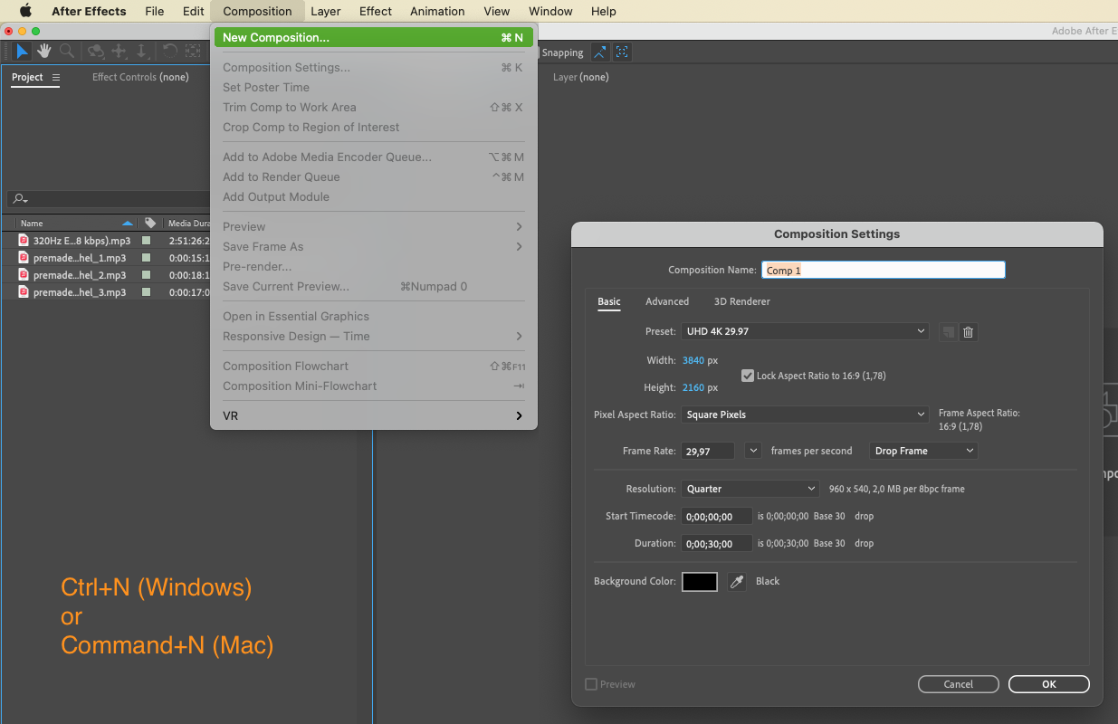 Once your audio files are imported, you need to create a new composition. Go to the Composition menu at the top and select “New Composition.”
