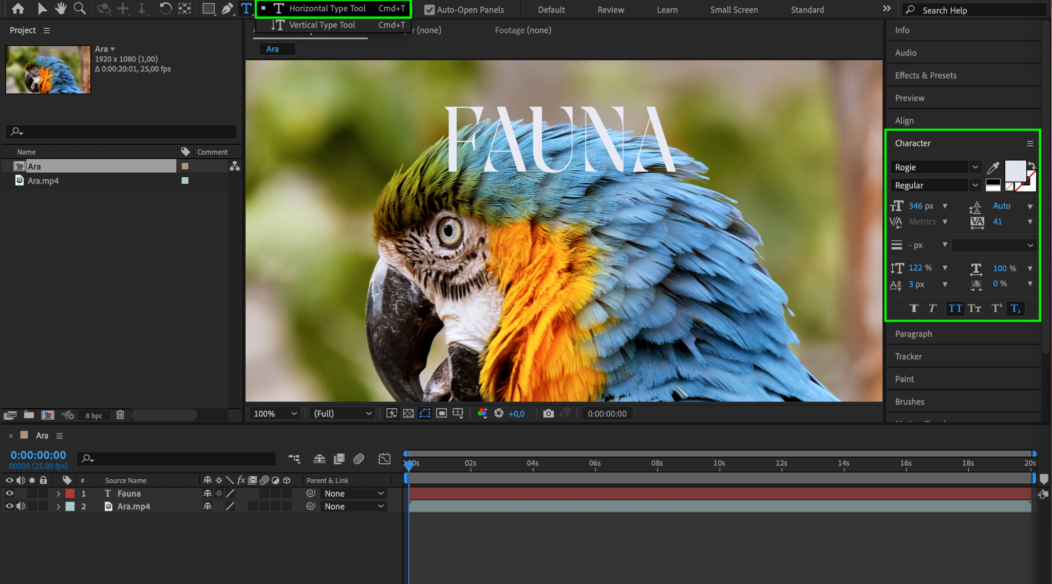 Then, use the Text tool from the toolbar to create a new text layer within your composition. Customize the font, size, color, and other text properties using the Character panel.