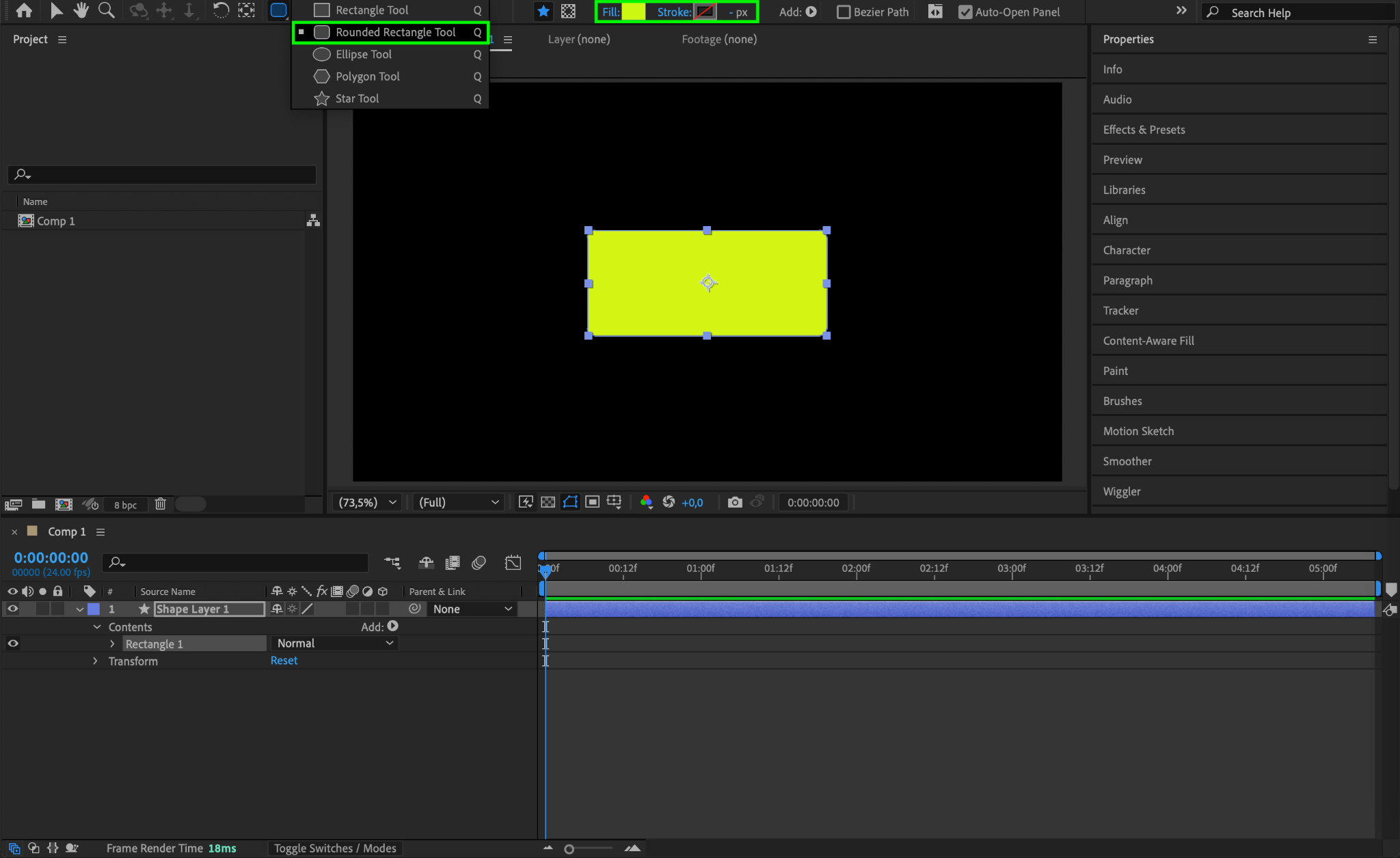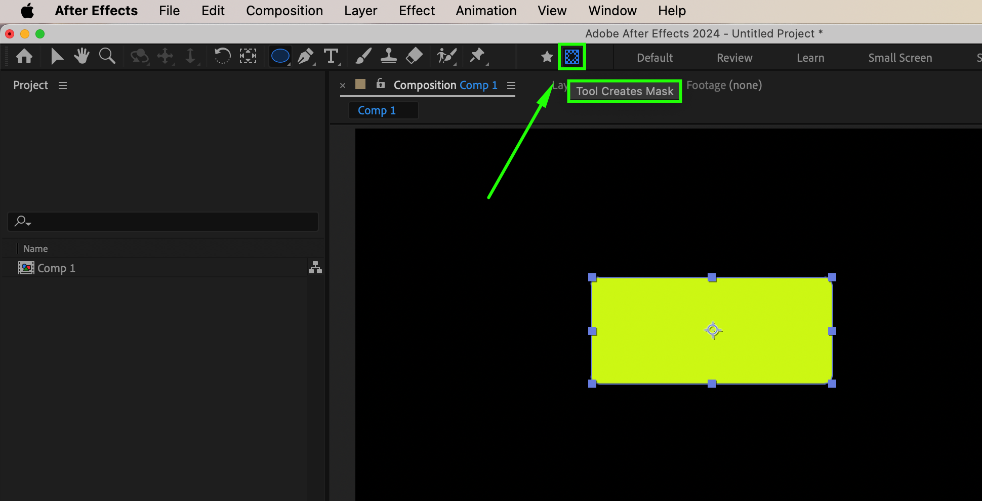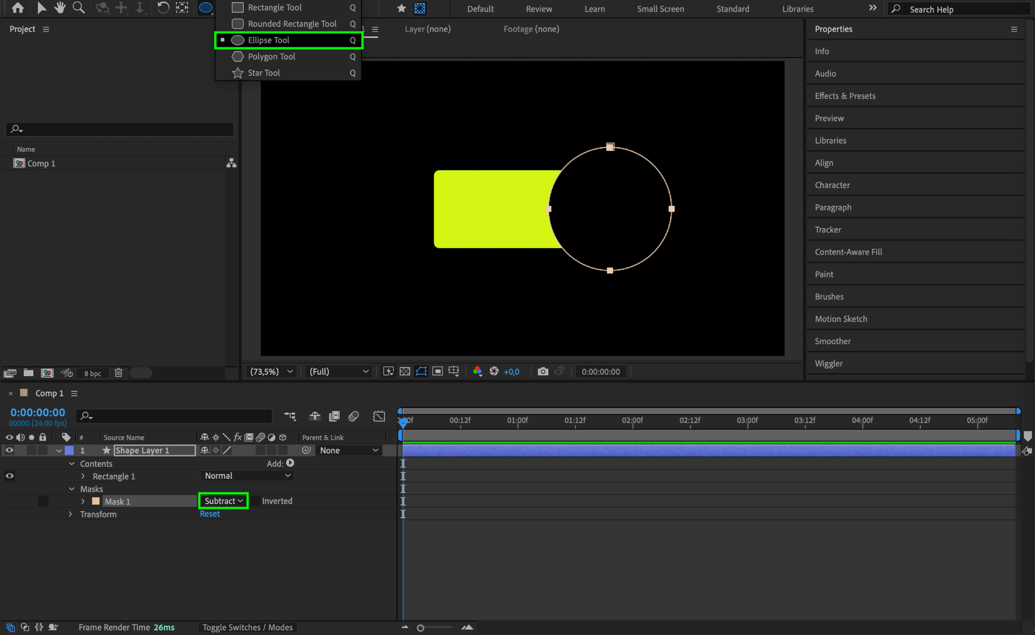To add a mask, select the Shape Layer in the Timeline. Then, choose the Shape Tool (Q) and enable the “Tool Creates Mask” option in the top toolbar. Draw a new shape directly on top of the existing one – this will automatically create a mask instead of a new shape.