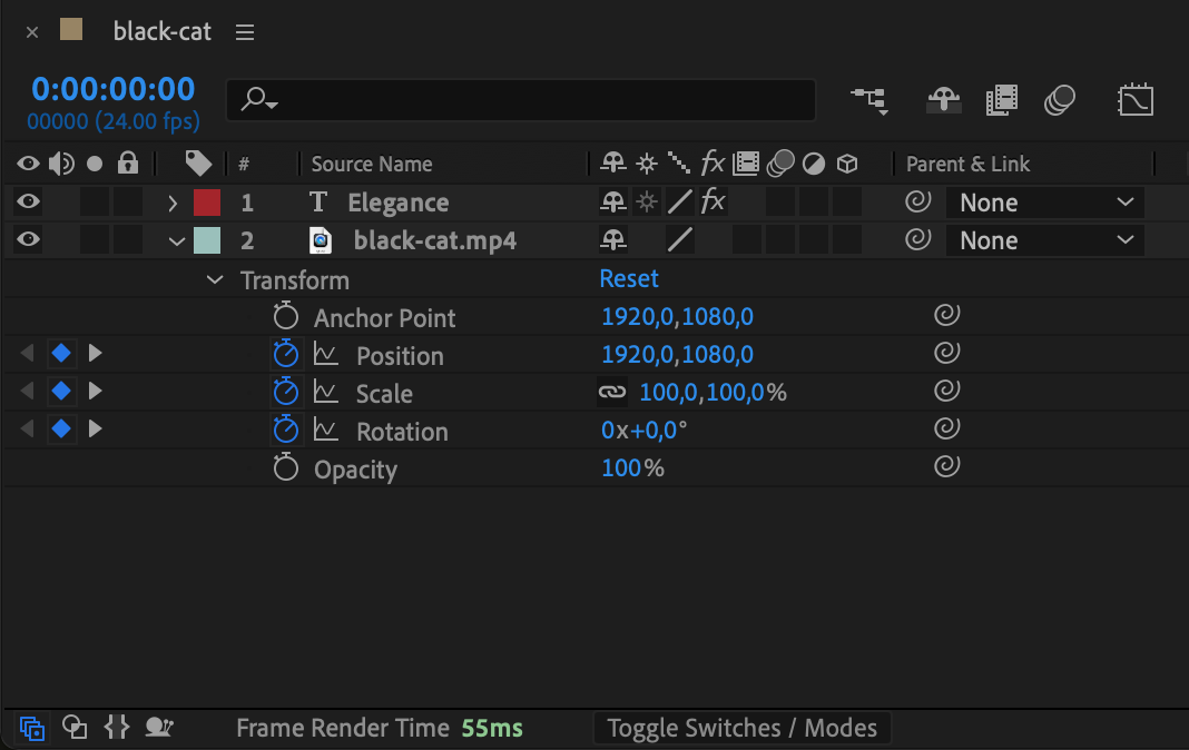 If you prefer to navigate manually, click the small triangle arrow next to a layer to expand its properties. Then, expand Transform, Effects, or Masks to find keyframed values like Position, Scale, Opacity, and more.