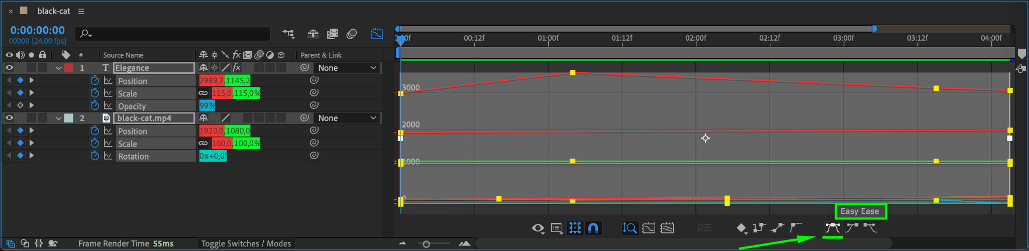 Once all keyframes are visible, you can easily move them, edit their values, or apply easing for smoother animations. Use the Graph Editor (by clicking the Graph Editor button) for more precise control over motion curves.