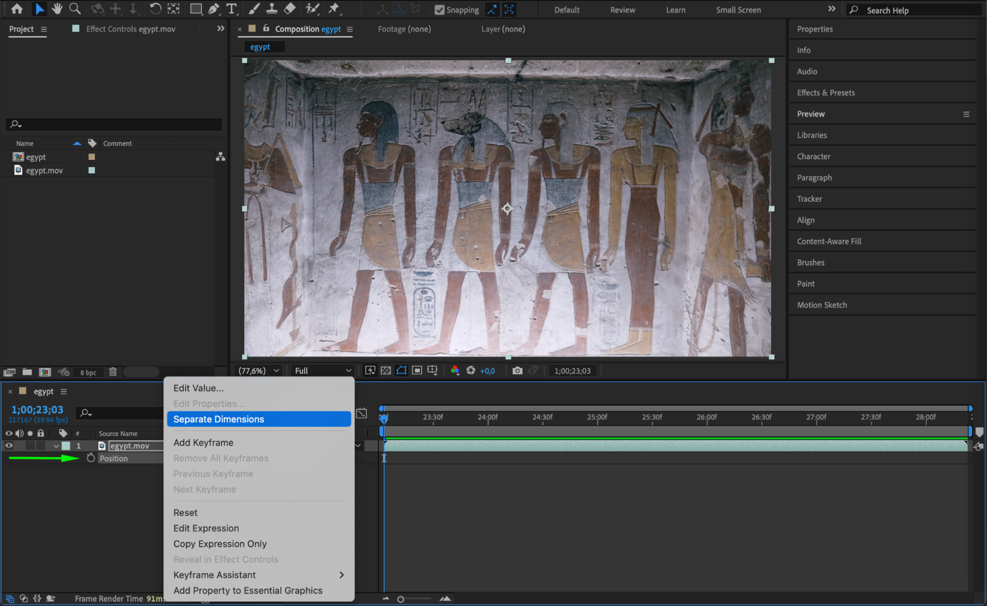 Select your video layer and press “P” to open the Position property. Right-click on Position and choose Separate Dimensions. For the Y Position, click the stopwatch while holding Alt/Option and enter: