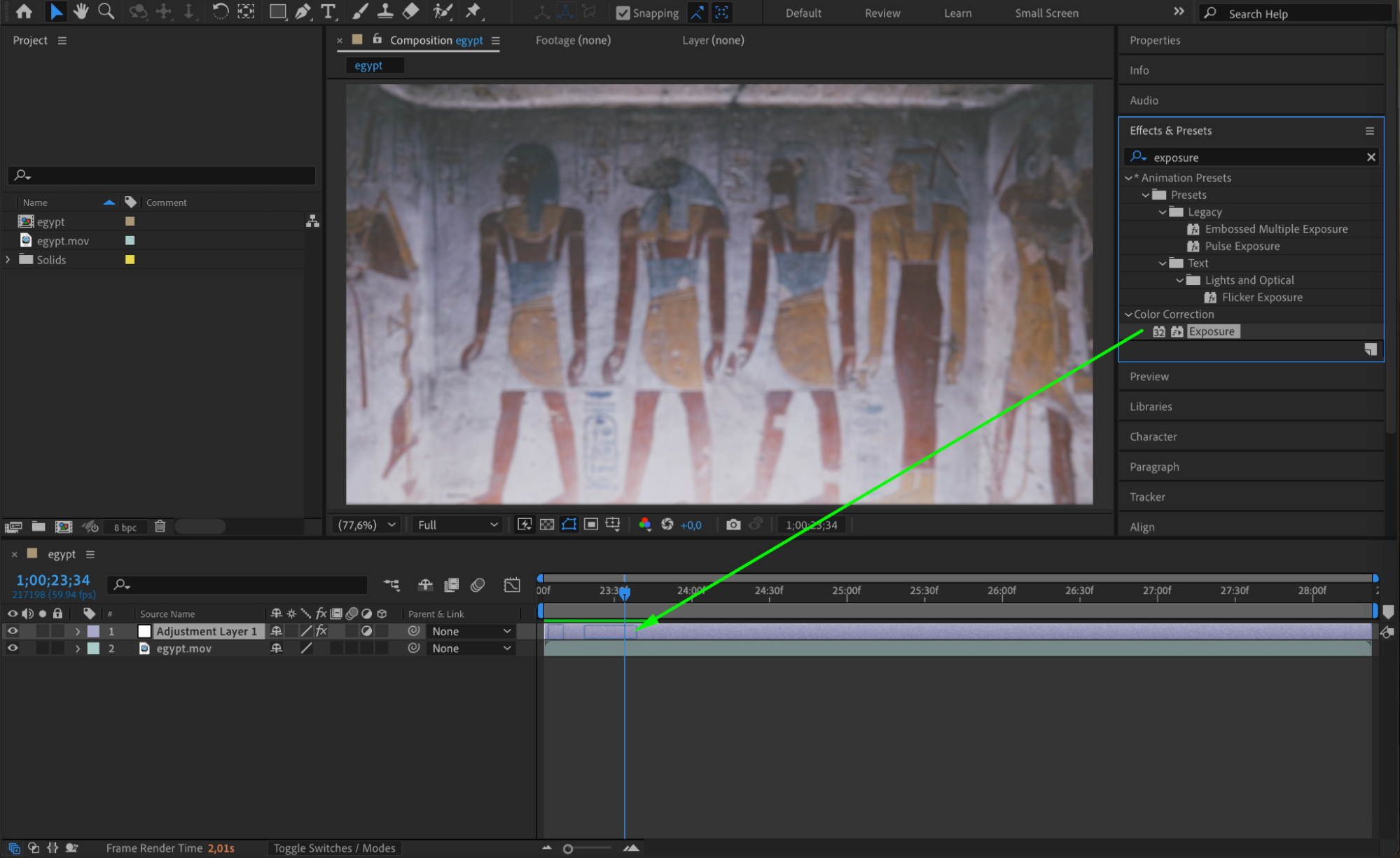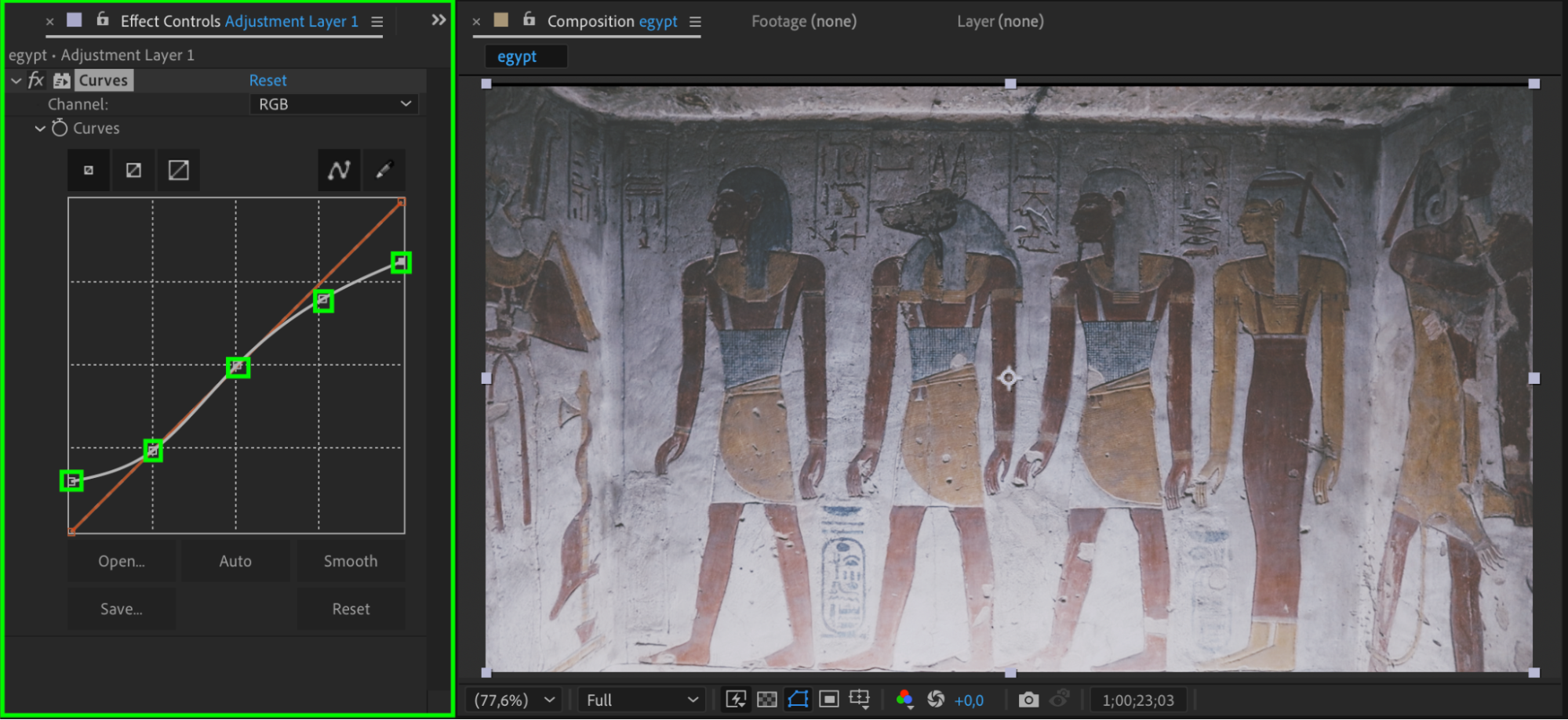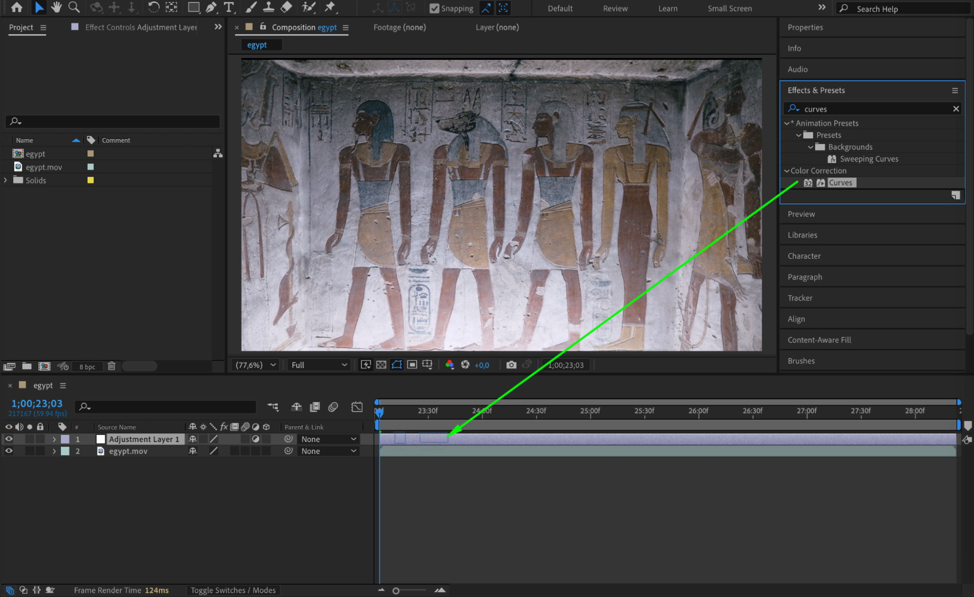 Go to the Effects & Presets panel and search for Curves. Drag it onto the Adjustment Layer. In the Effect Controls Panel, shape the curve into an “S” to increase contrast, enhancing the faded film look.