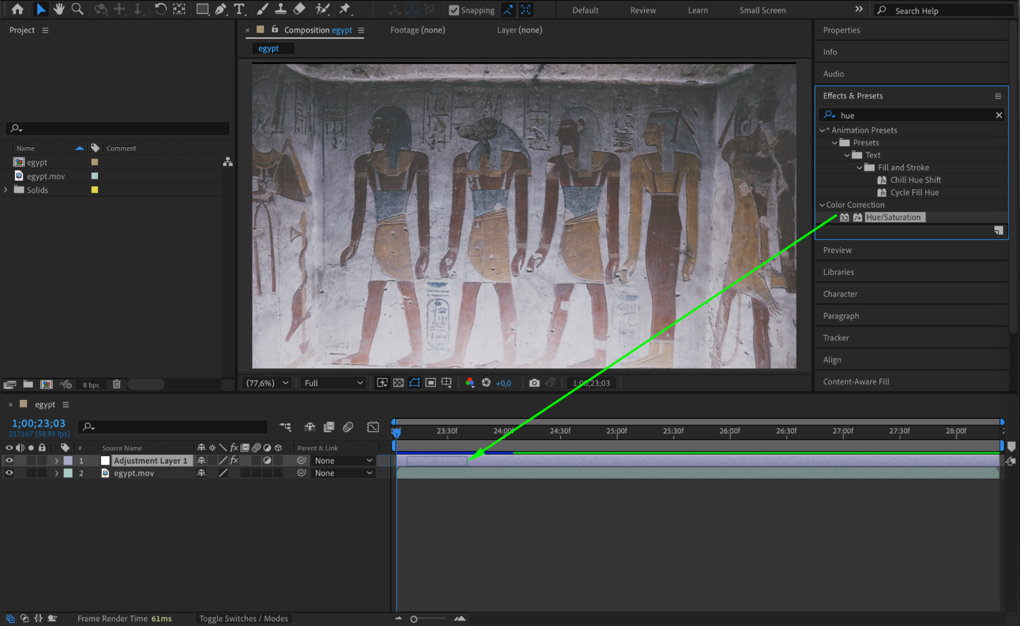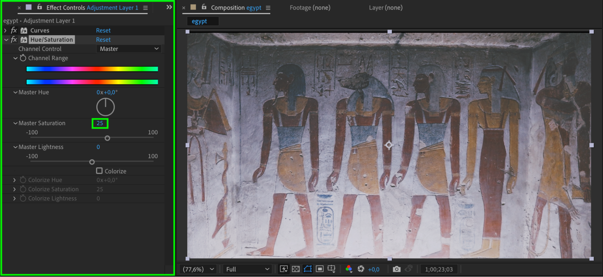 Apply the Hue/Saturation effect to the Adjustment Layer. In the Effect Controls Panel, set Master Saturation to 25 to give your video a washed-out appearance, similar to old film.