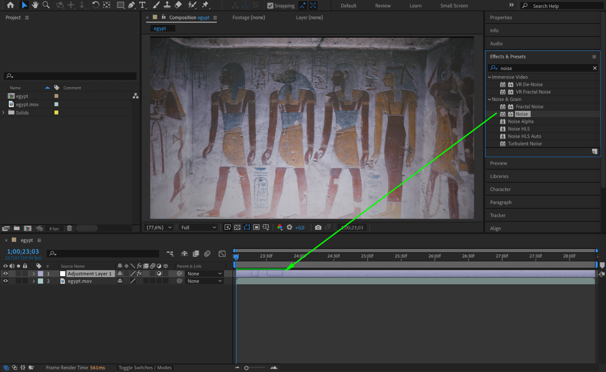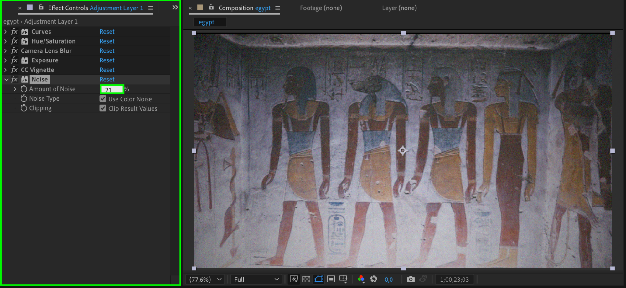 Apply the Noise effect to the Adjustment Layer. Set the Amount of Noise to 21 to introduce film grain, making the footage look aged.