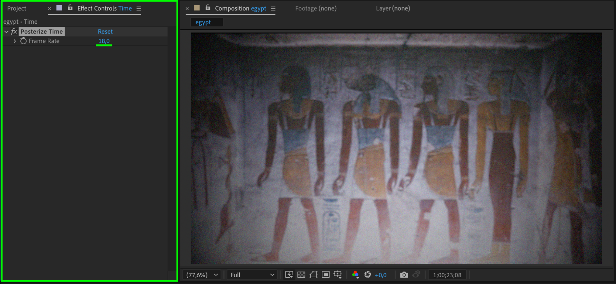 Apply the Posterize Time effect to the Time adjustment layer. Set the Frame Rate to 18 to mimic the lower frame rate of vintage film cameras.