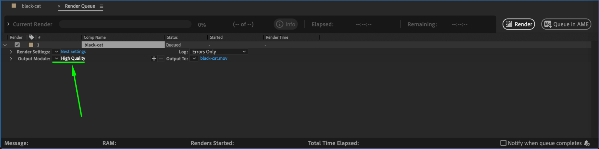 In the Render Queue, click the white text next to Output Module (e.g., “High Quality”) to customize your render settings. Choose the appropriate format (e.g., H.264) and ensure the depth, channels, and codec align with your project’s requirements.