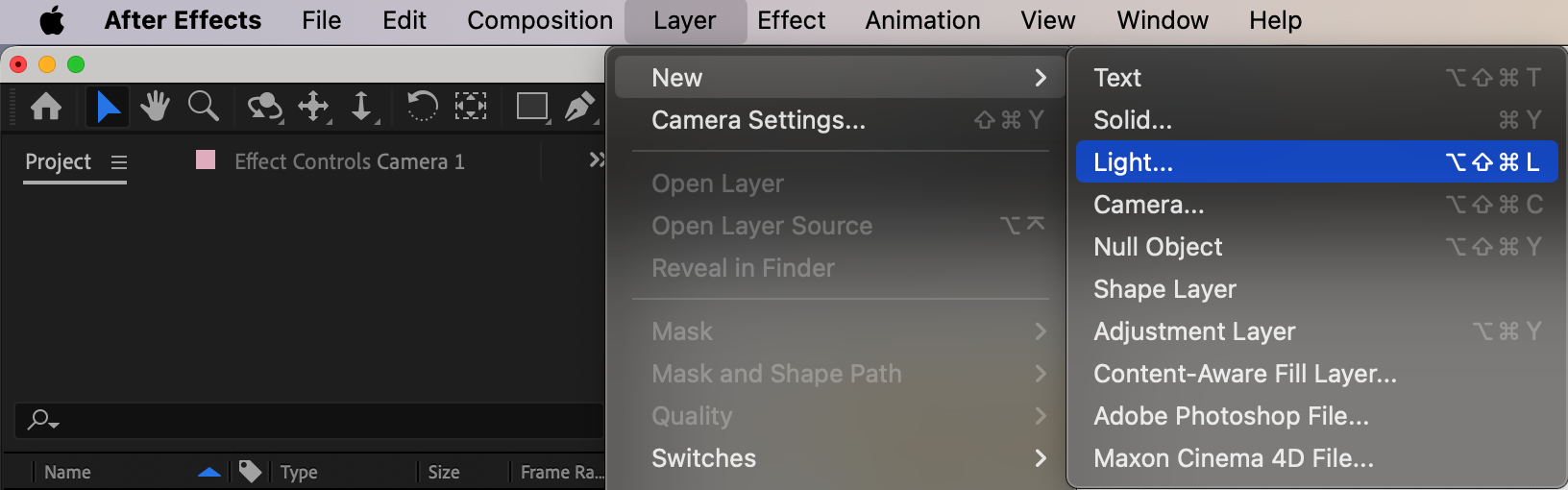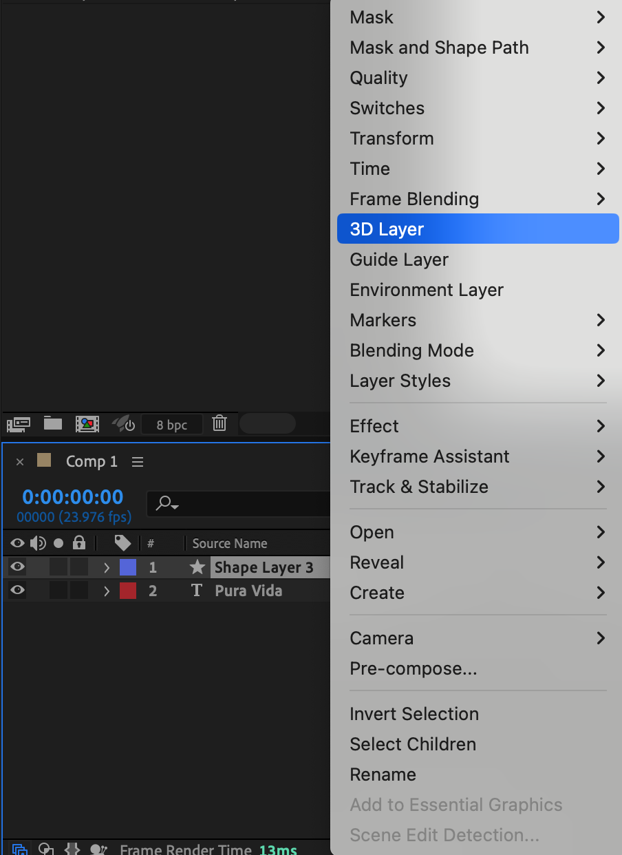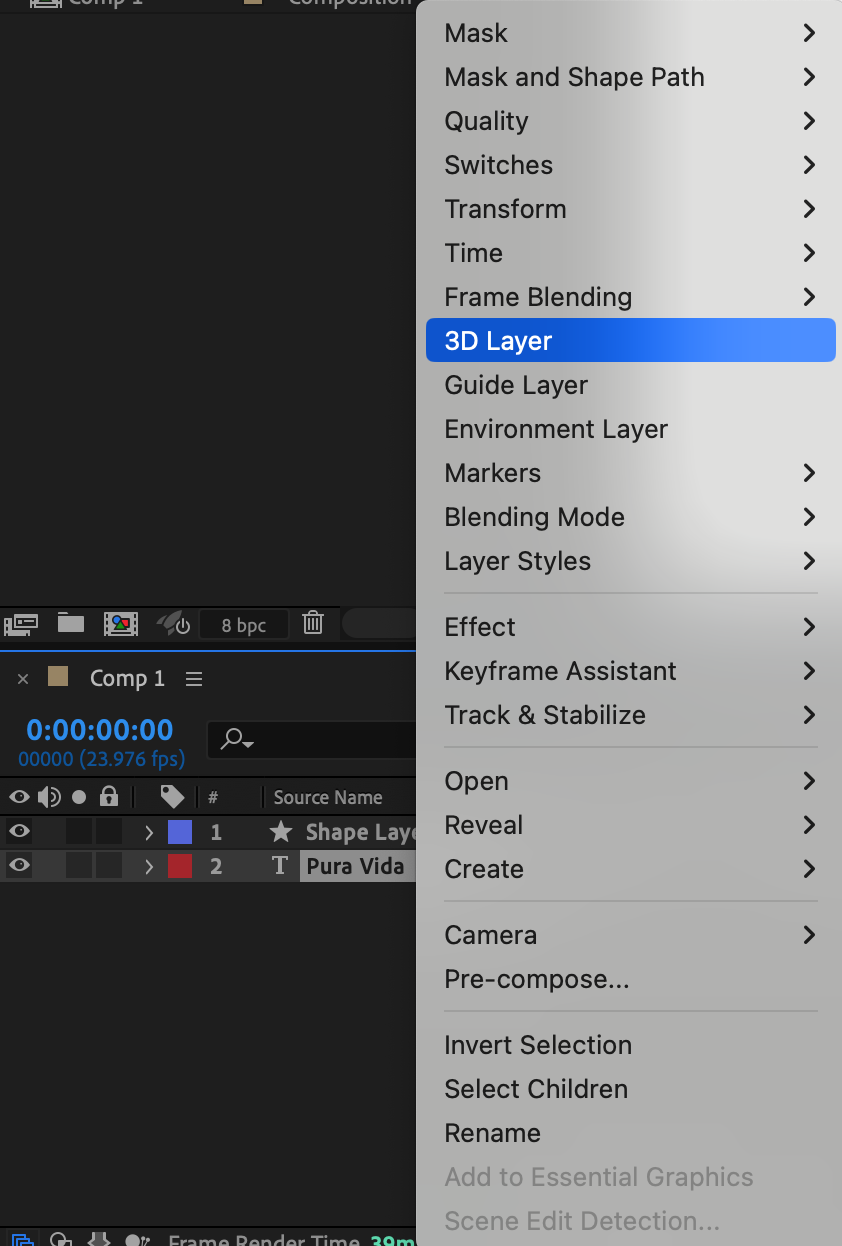 Select your layer and click on the “3D” switch. Right-click on the switch to open a submenu and choose “3D Layer.” This will convert your layer to a 3D layer.