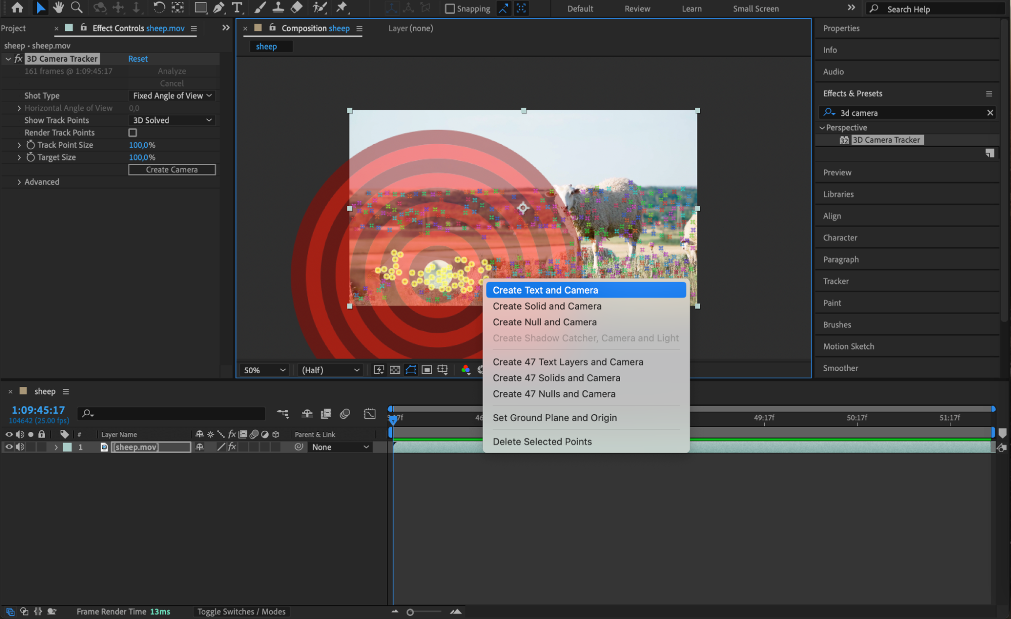 Once the analysis is complete, you’ll see multiple tracking points overlaid on your footage. Identify the area where you want the text to appear. Right-click on a cluster of points in that area and select Create Text and Camera from the submenu. This will generate a text layer and a camera linked to the tracked movement.