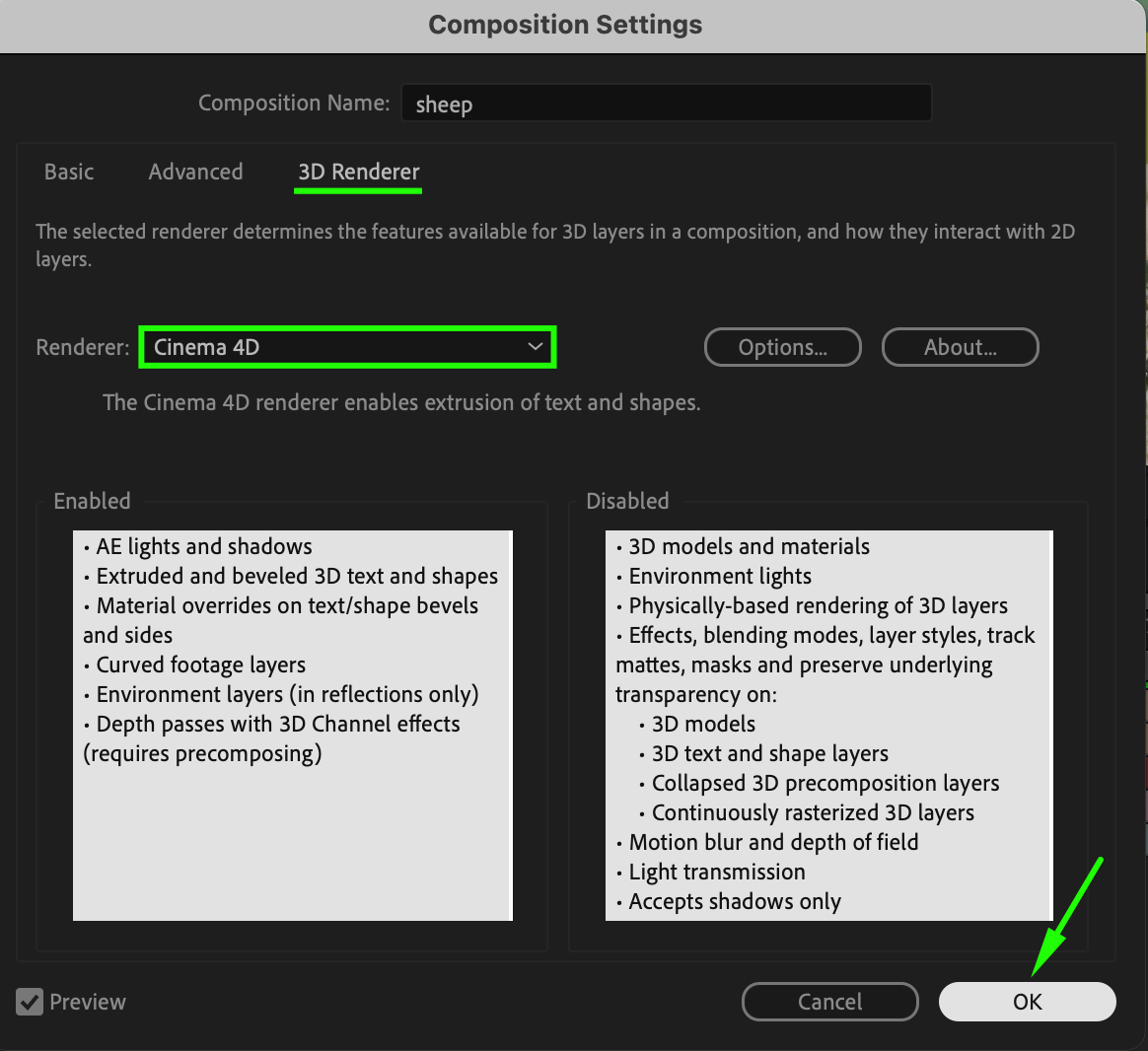 Navigate to Composition > Composition Settings and select the 3D Renderer tab. Choose Cinema 4D as your render engine. This unlocks advanced 3D features for your text layer.
