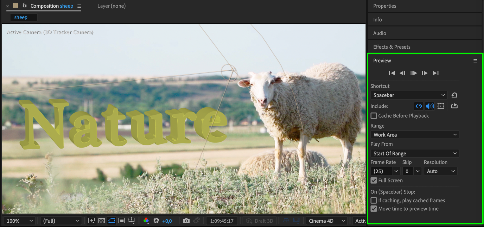 Press the Spacebar to preview your composition. Observe how the text follows the movement of the camera and integrates into the scene. Make any necessary adjustments to lighting or text properties for optimal results.