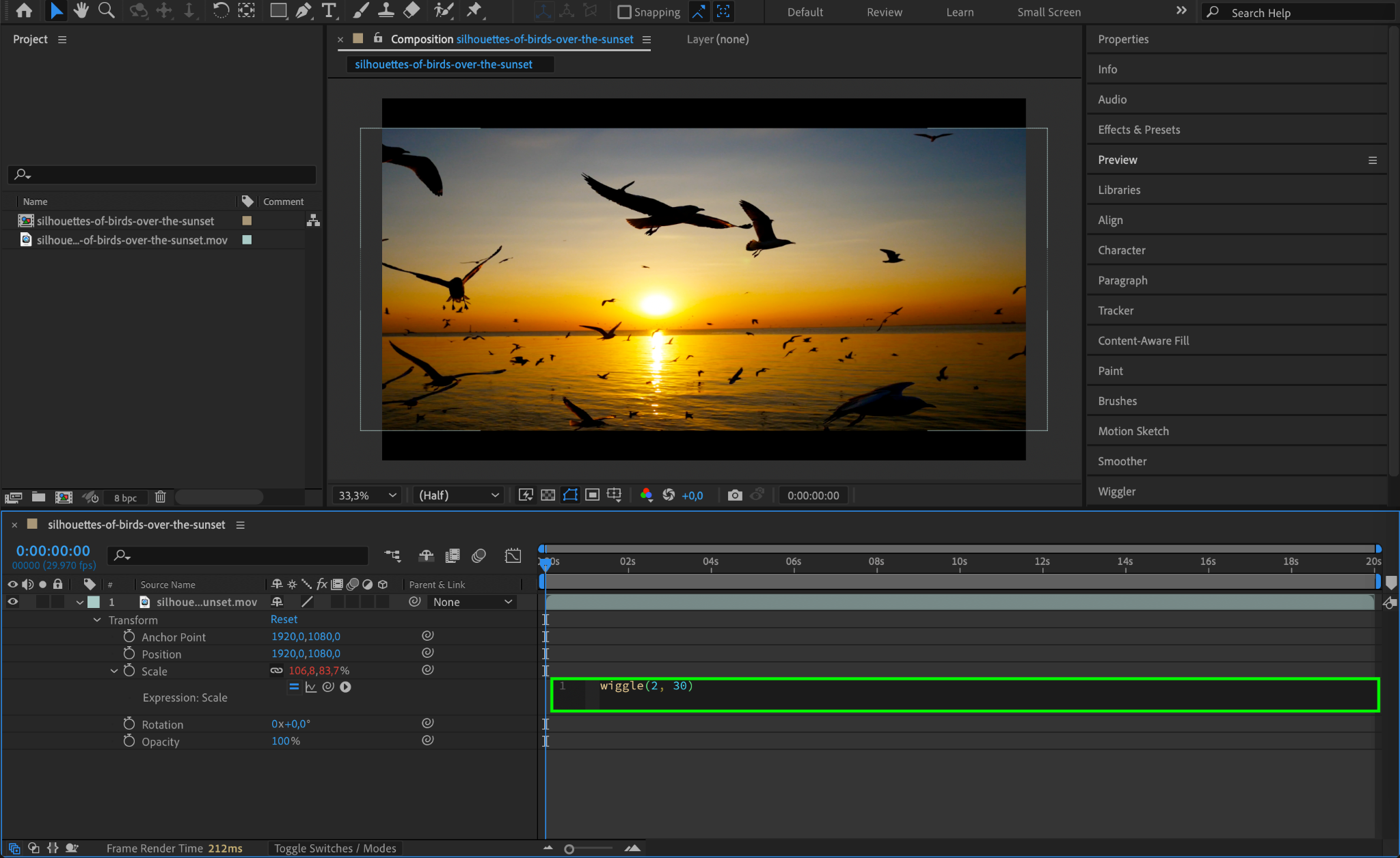 This expression will make the property wiggle (move randomly) with a frequency of 2 times per second and a magnitude of 30 units. You can experiment with different functions like time, loopOut(), and wiggle() to create various animation effects.