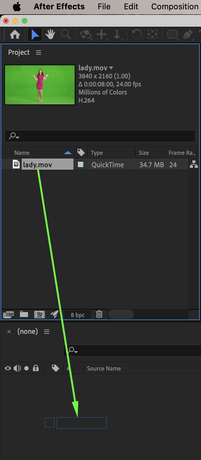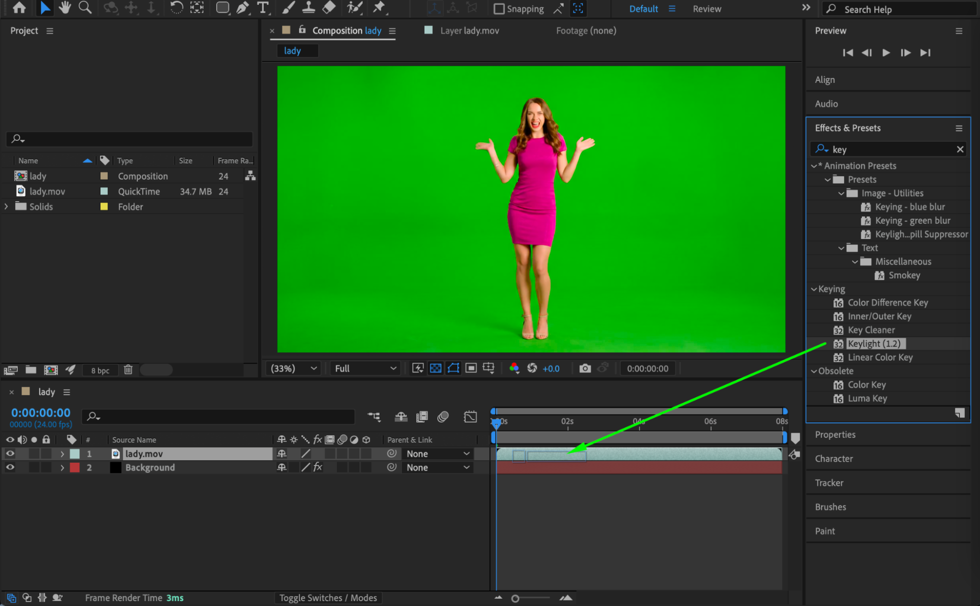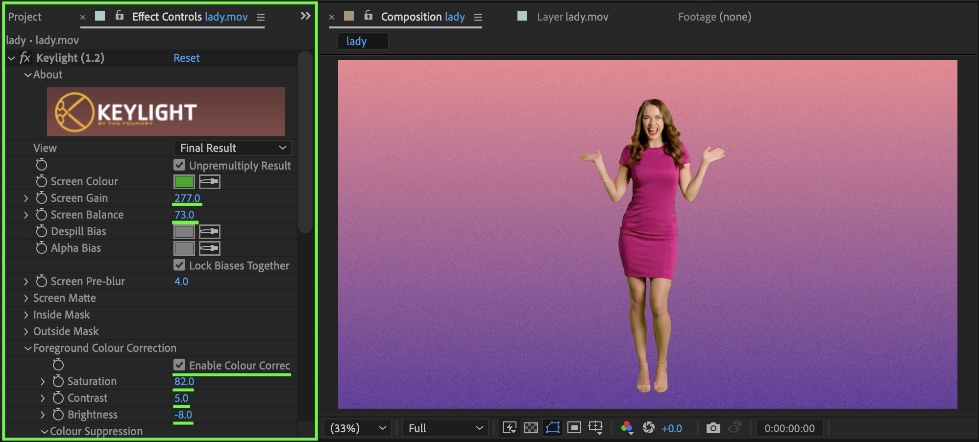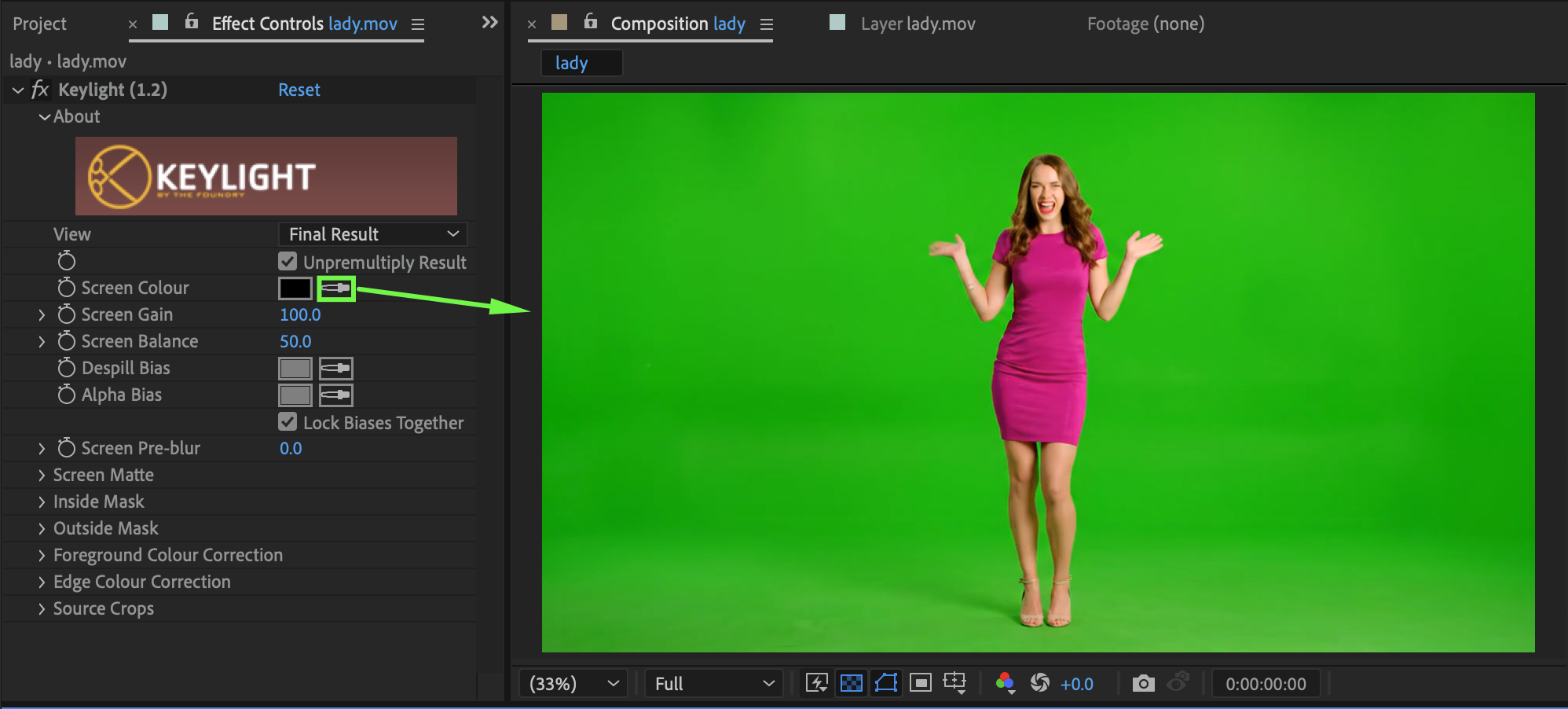 Select the footage layer. From the Effects & Presets panel, apply Keylight (1.2). Use the Screen Colour eyedropper to remove the green background. If needed, enable Colour Correction inside Keylight and adjust the settings so the subject matches the new background (another video or a solid color).