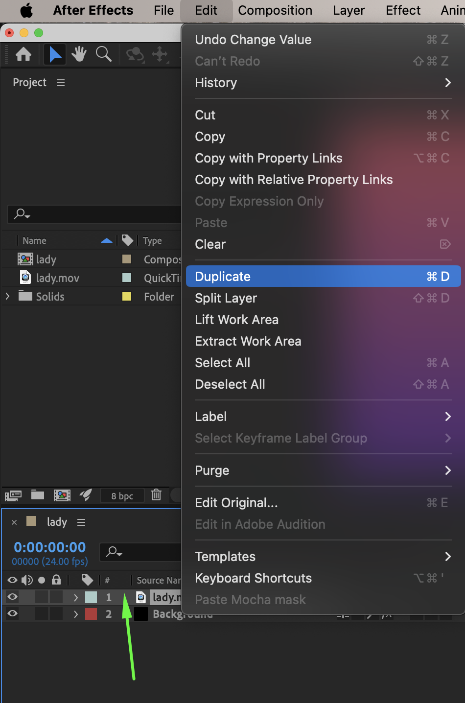 Duplicate the keyed footage layer. Rename the duplicate layer to Shadow.