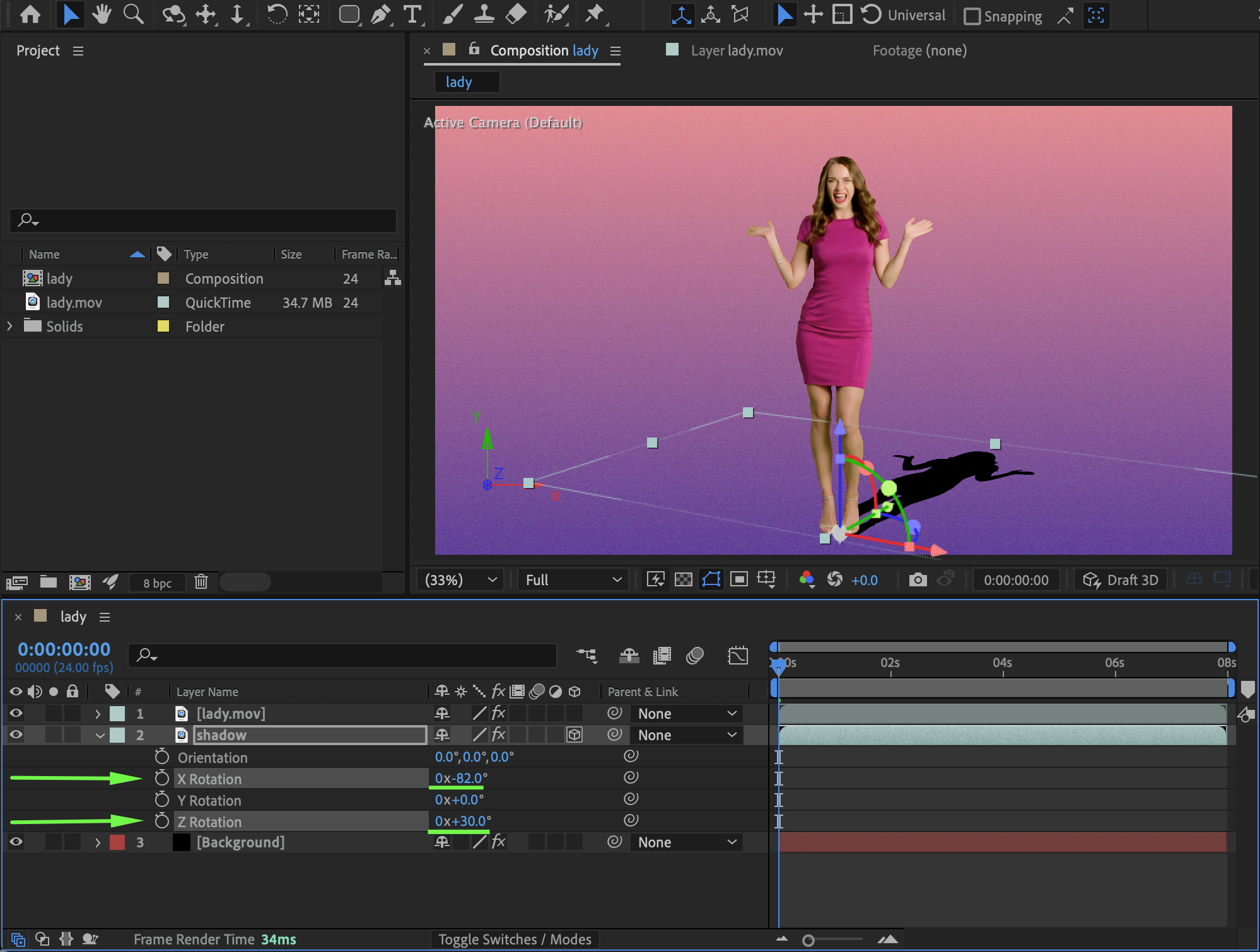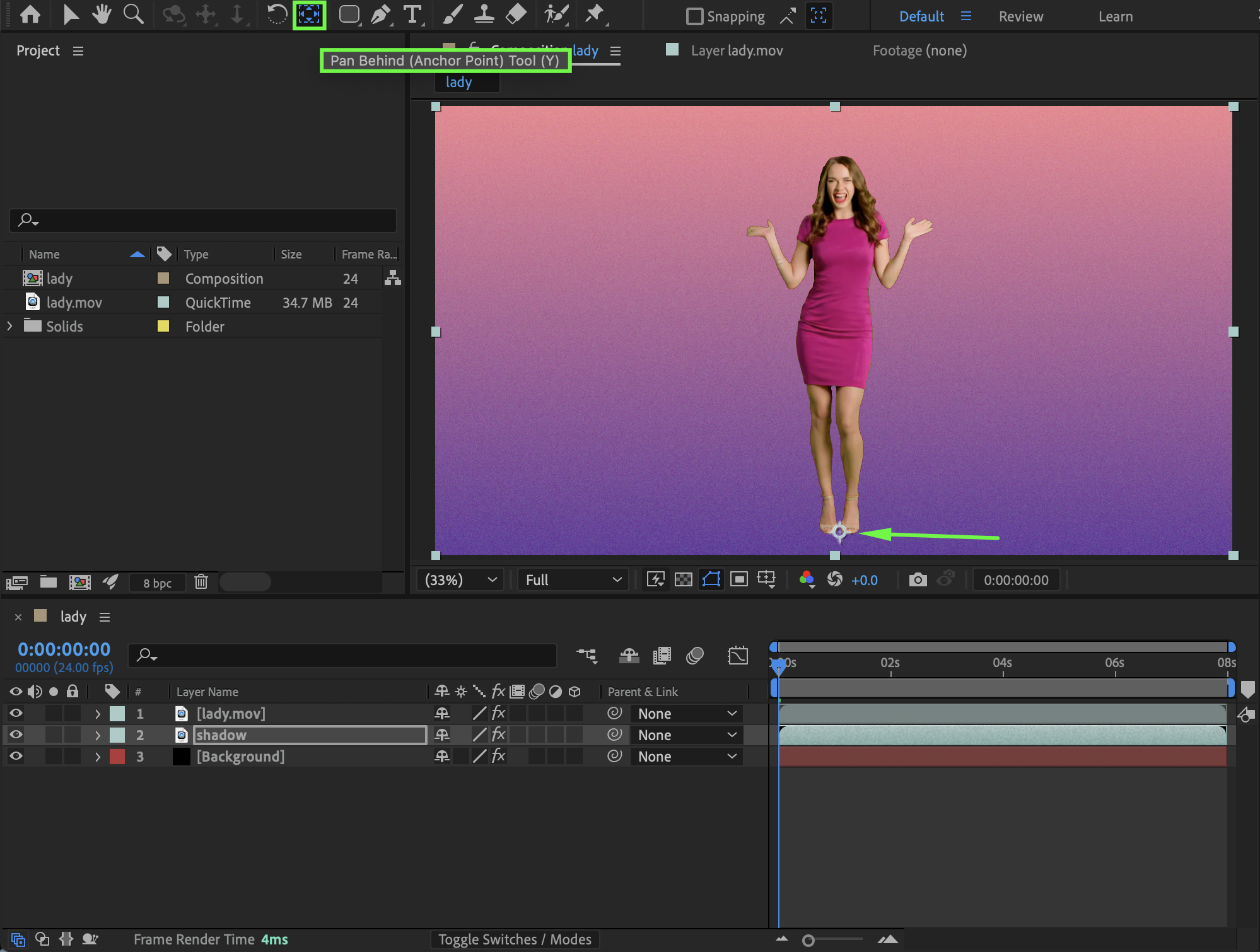 Select the Shadow layer. Use the Pan Behind Tool (Y) to move the Anchor Point to the feet of the person. This allows the shadow to rotate naturally from the ground contact point.