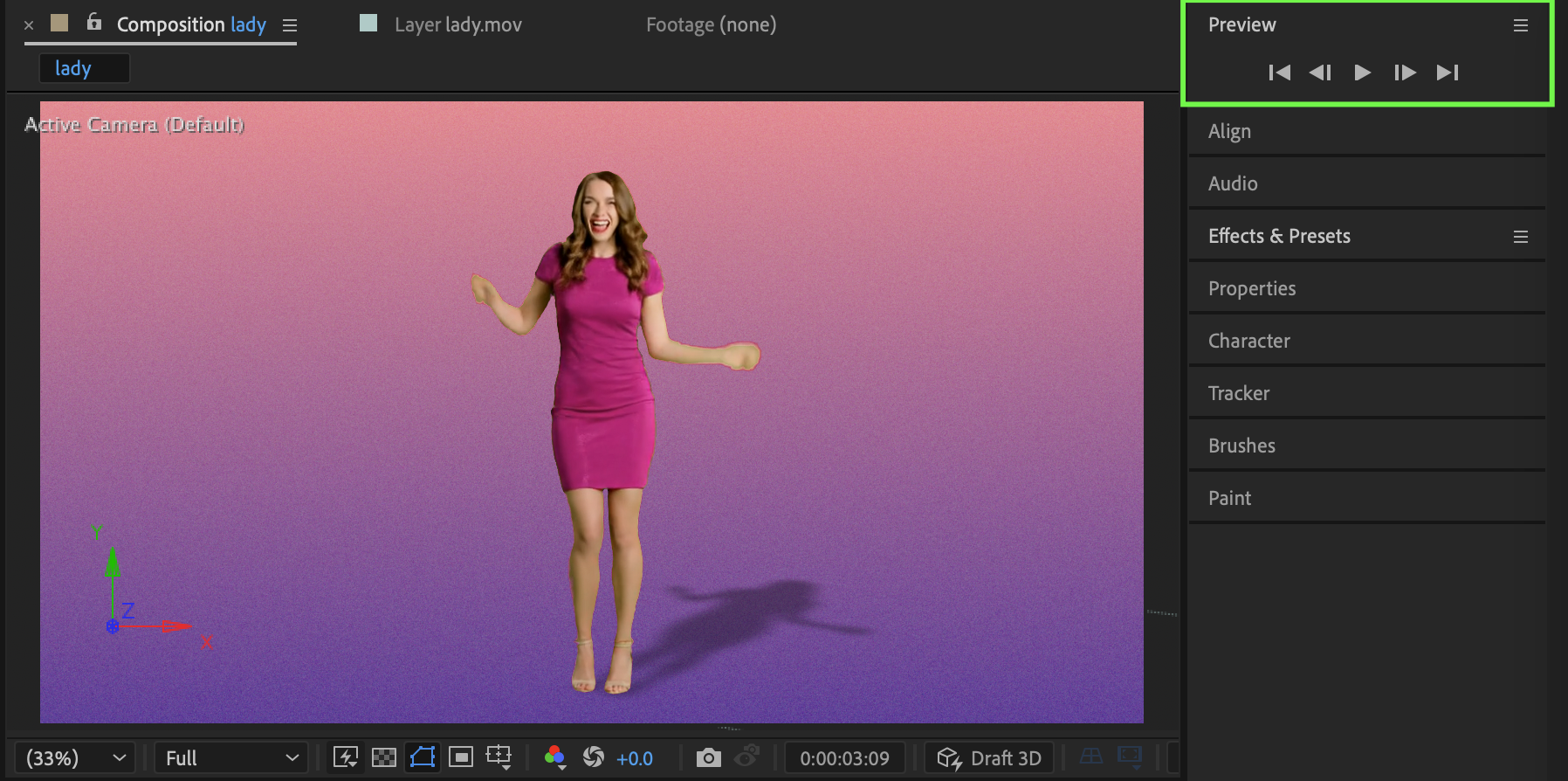 Preview the composition and fine-tune the rotation, blur, and opacity until the shadow feels natural and properly integrated into the scene.