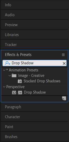 2. Apply Drop Shadow Effect: With the solid layer selected, go to the “Effects & Presets” panel and search for the “Drop Shadow” effect. Drag and drop the effect onto the solid layer.