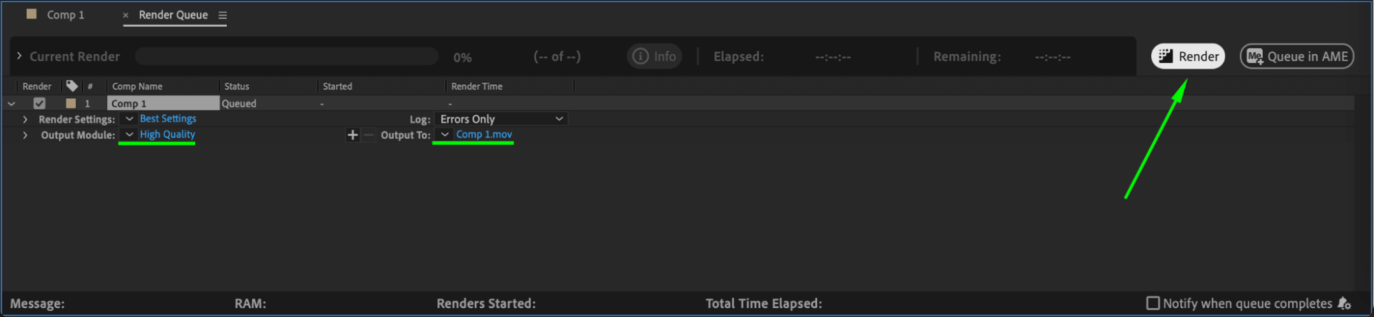 Once you’re satisfied with the stroke effect, go to Composition > Add to Render Queue, set your desired output format, and click Render to export your project.