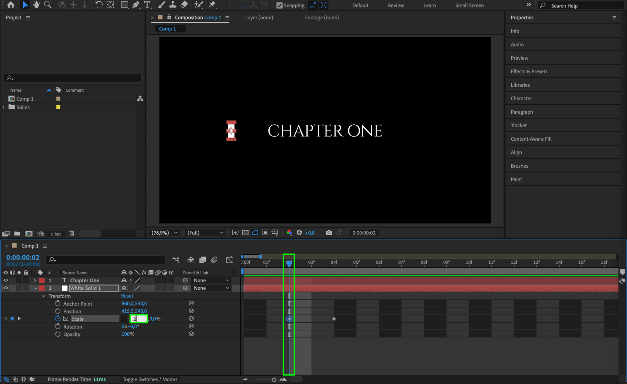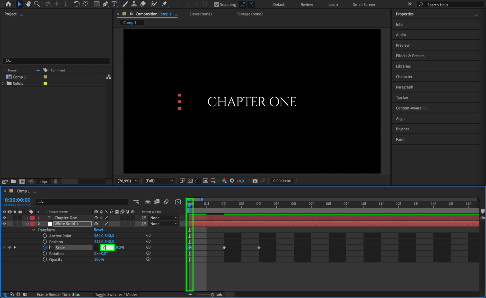 Move the Current Time Indicator (CTI) 4 frames forward and click the stopwatch icon next to Scale to create a keyframe.