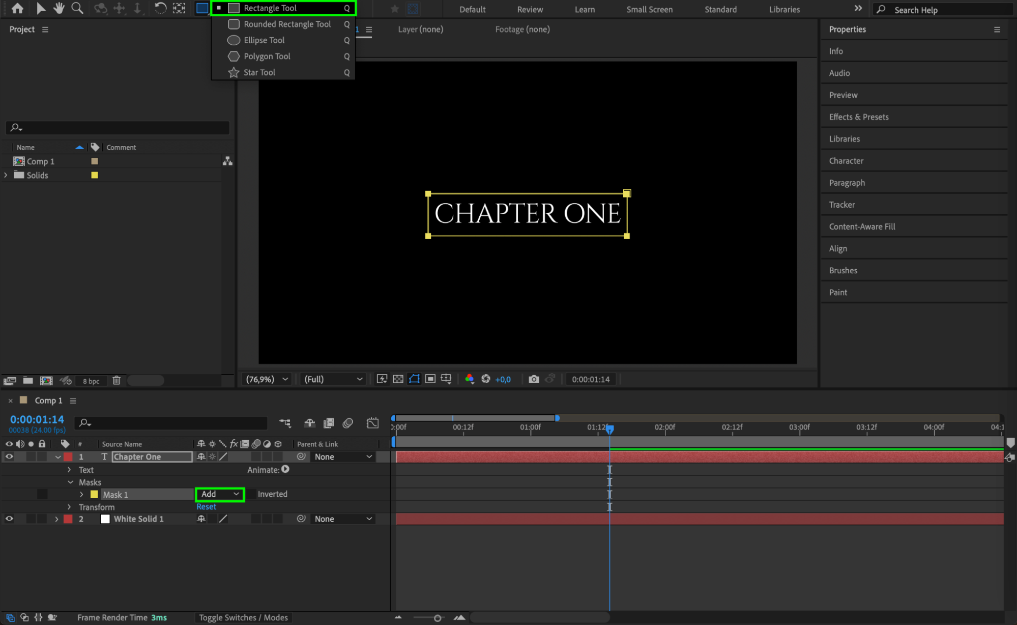 Select the Rectangle Tool (Q) and draw a mask around the text to hide it initially. This will allow the text to be revealed only when the solid passes over it.