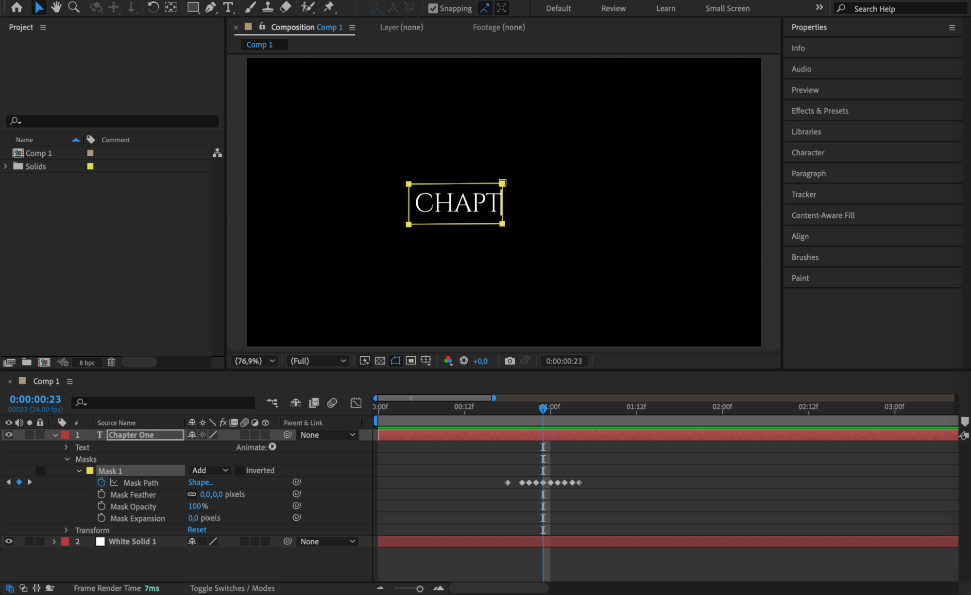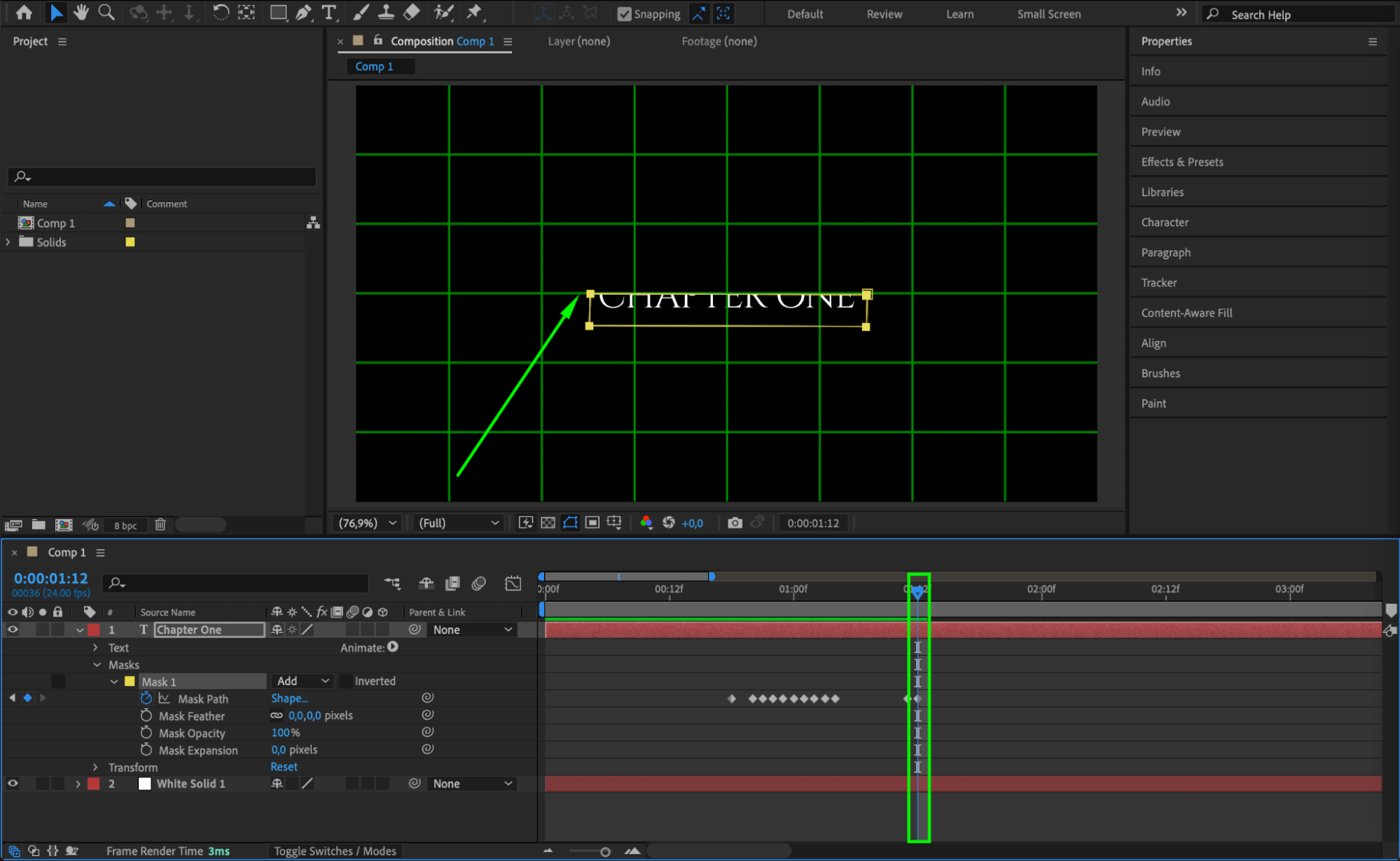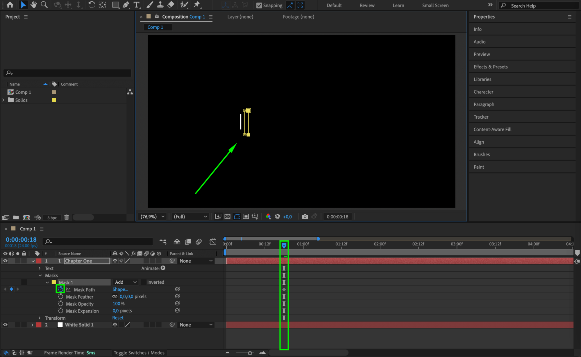 Click the stopwatch next to Mask Path and adjust the mask frame by frame to ensure the text appears smoothly as the solid moves.