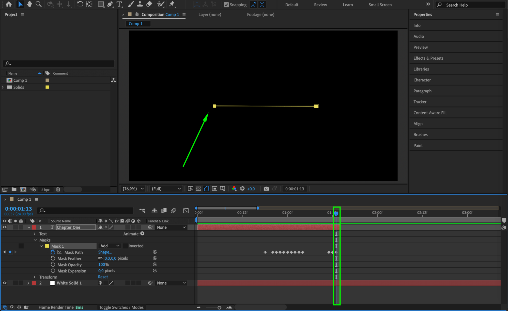 At the end of the animation, after the text is fully revealed, simulate a collapsing effect by adjusting the Mask Path. Bring the top-right corner of the mask down to meet the bottom-right, and the top-left to the bottom-left, making the text shrink and disappear. Trim the layer by pressing “Alt/Option + ]”.