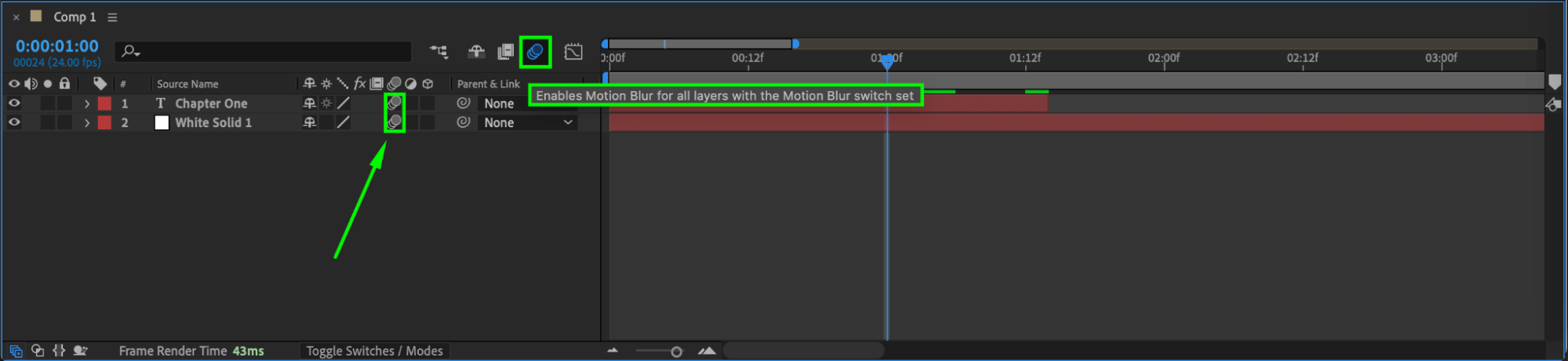 In the Timeline Panel, enable Motion Blur for both the text and the solid layer to create a more natural movement.