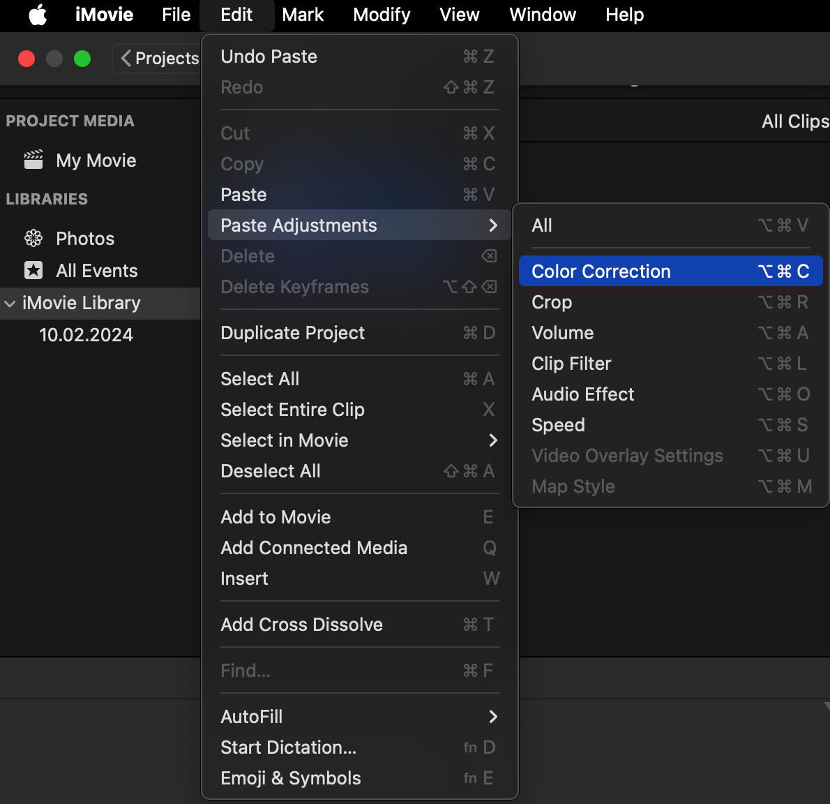 5. Utilize Paste Adjustments: In iMovie, the “Paste Adjustments” feature allows you to quickly apply settings, including color correction and effects, from one clip to another. Simply select the clip with the desired settings, copy them, then choose another clip and use “Paste Adjustments” to instantly apply the same parameters. This function facilitates the creation of a consistent style or color palette in your project, saving time on repetitive adjustments for each clip.