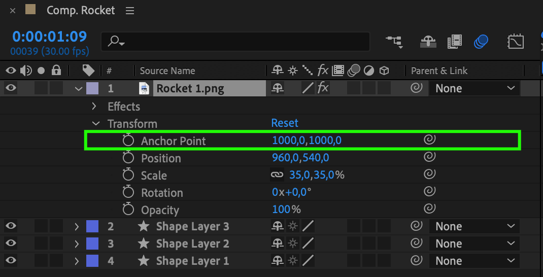 3. Find the Anchor Point property in the layer’s transform options.