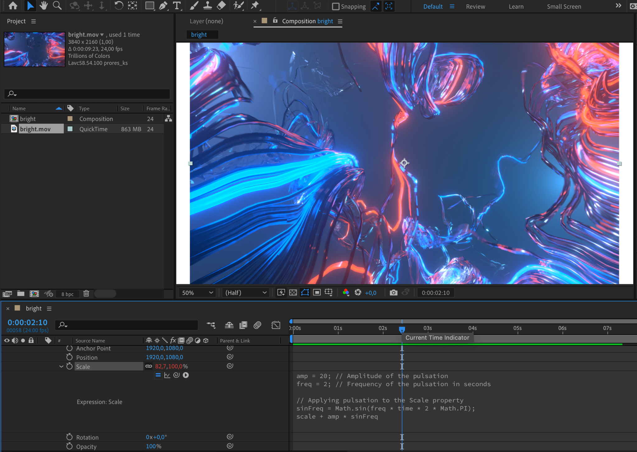 In this example, the variables amp and freq set the amplitude and frequency of the pulsation, respectively. The expression uses the sine function (Math.sin) to create pulsation based on time (time). You can adjust the values of amp and freq according to your preferences.