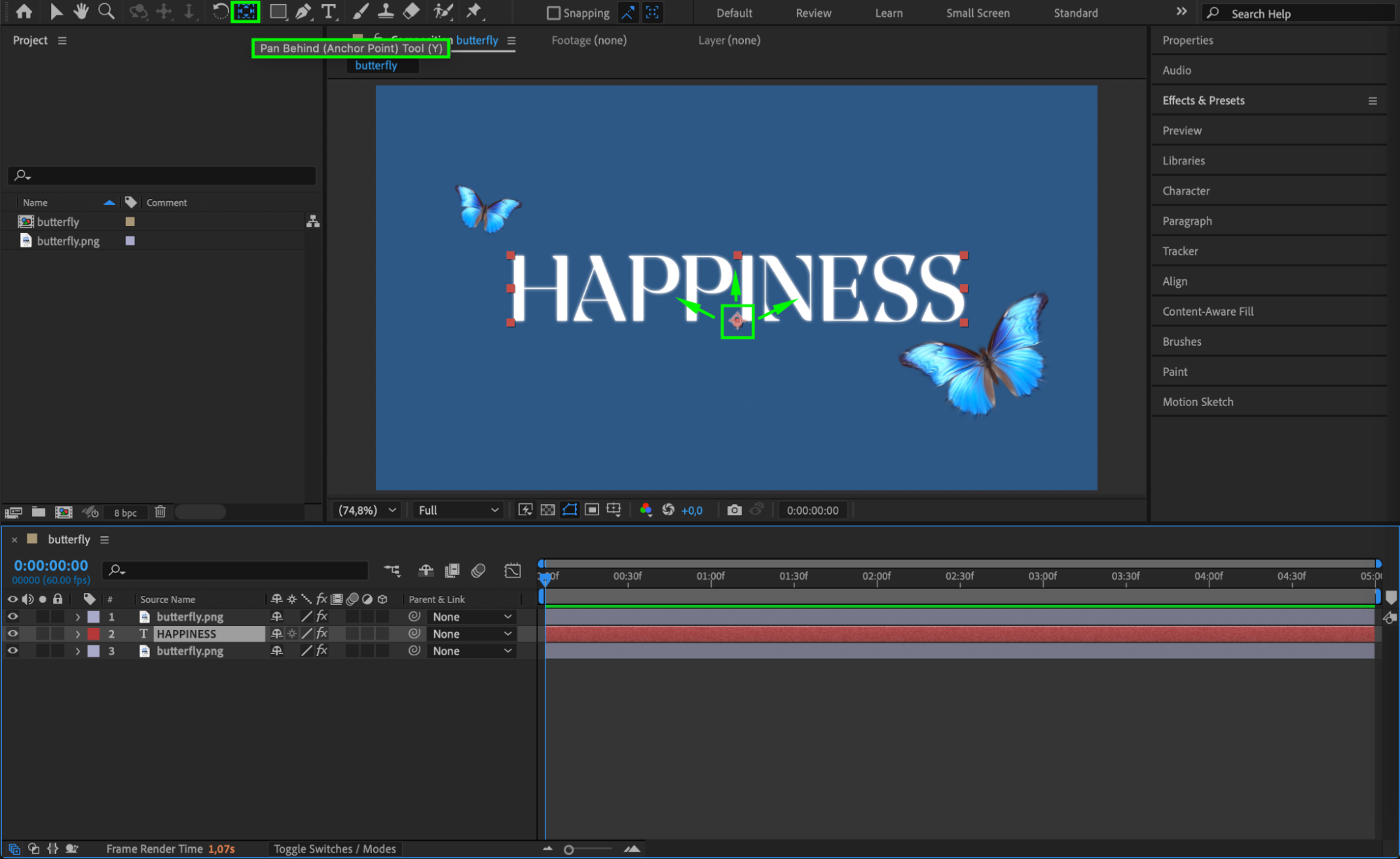 First, open your project and select the layer you want to edit. The anchor point will become visible. Choose the Pan Behind Tool (Y) from the toolbar. Then, click and drag the anchor point to reposition it. Now, any transformations like rotation or scaling will happen relative to this new point.