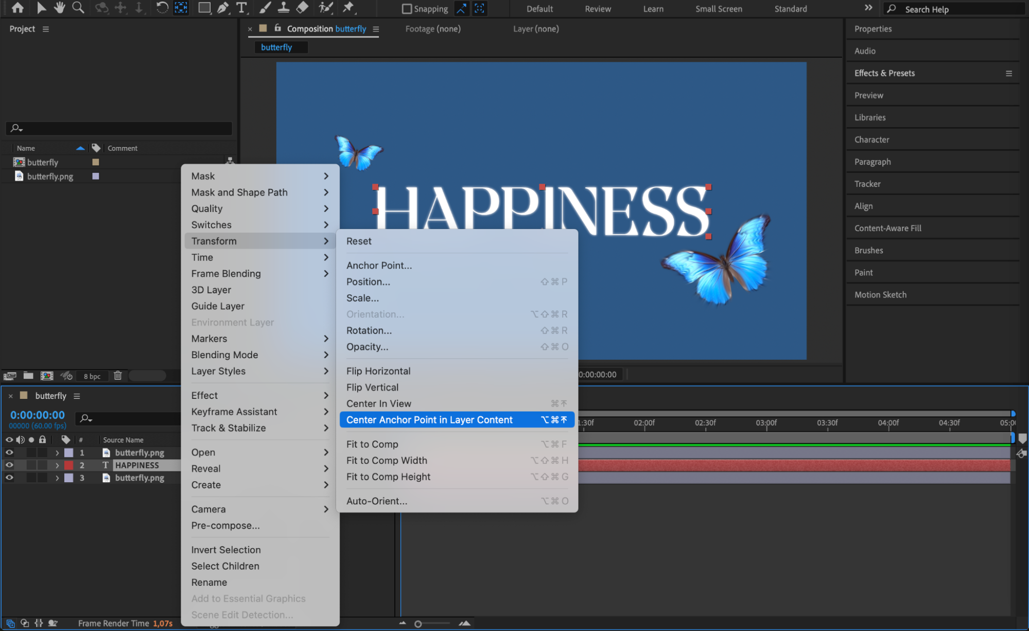 If you want the anchor point to automatically center itself in your layer, right-click on the layer, go to Transform > Center Anchor Point in Layer Content. This is a quick way to neatly center your anchor without manual adjustments.