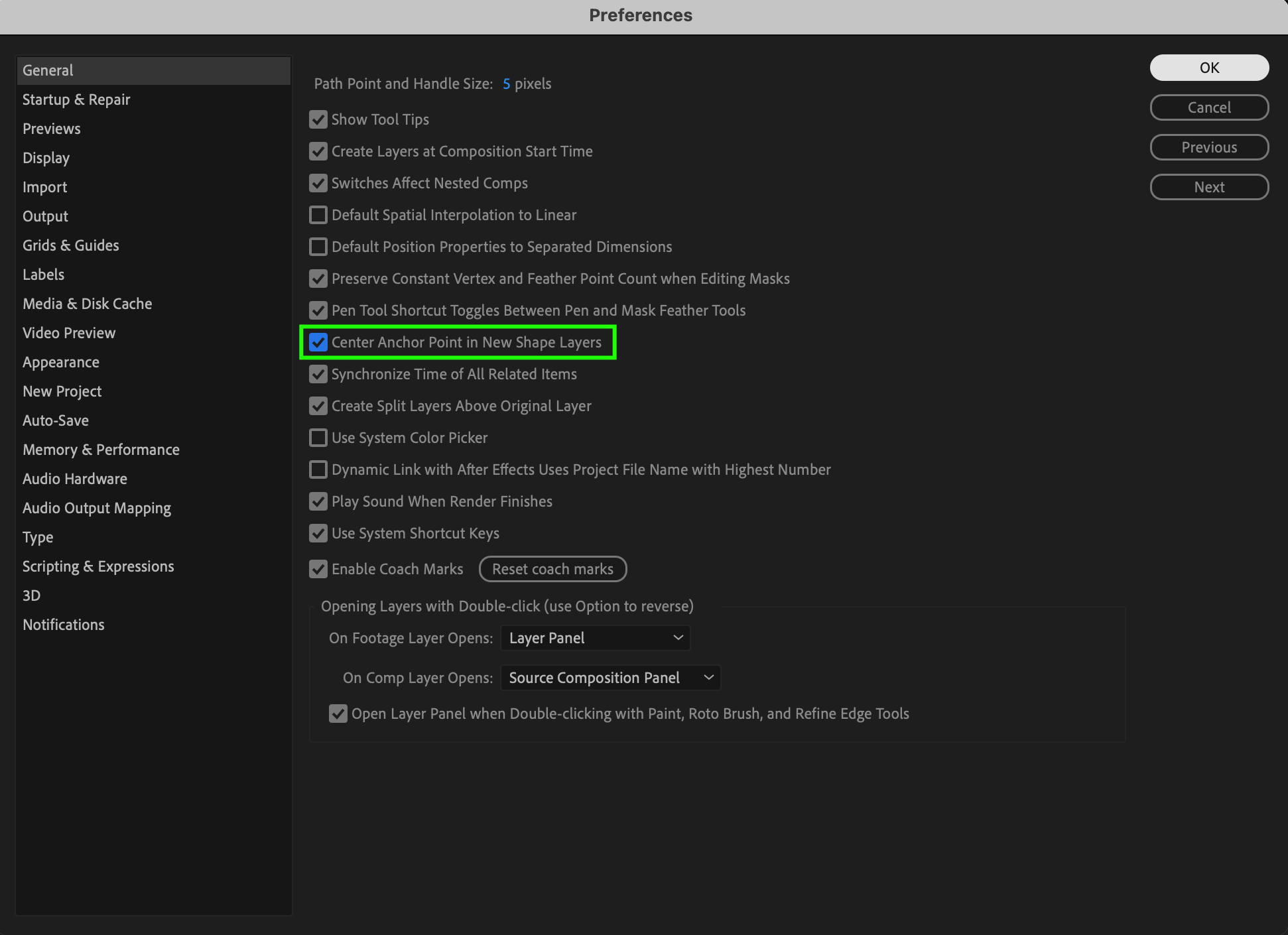 To save time when creating new shape layers, go to After Effects > Settings > General and check the box for Center Anchor Point in New Shape Layer. With this setting, every new shape you create will have its anchor point centered automatically.
