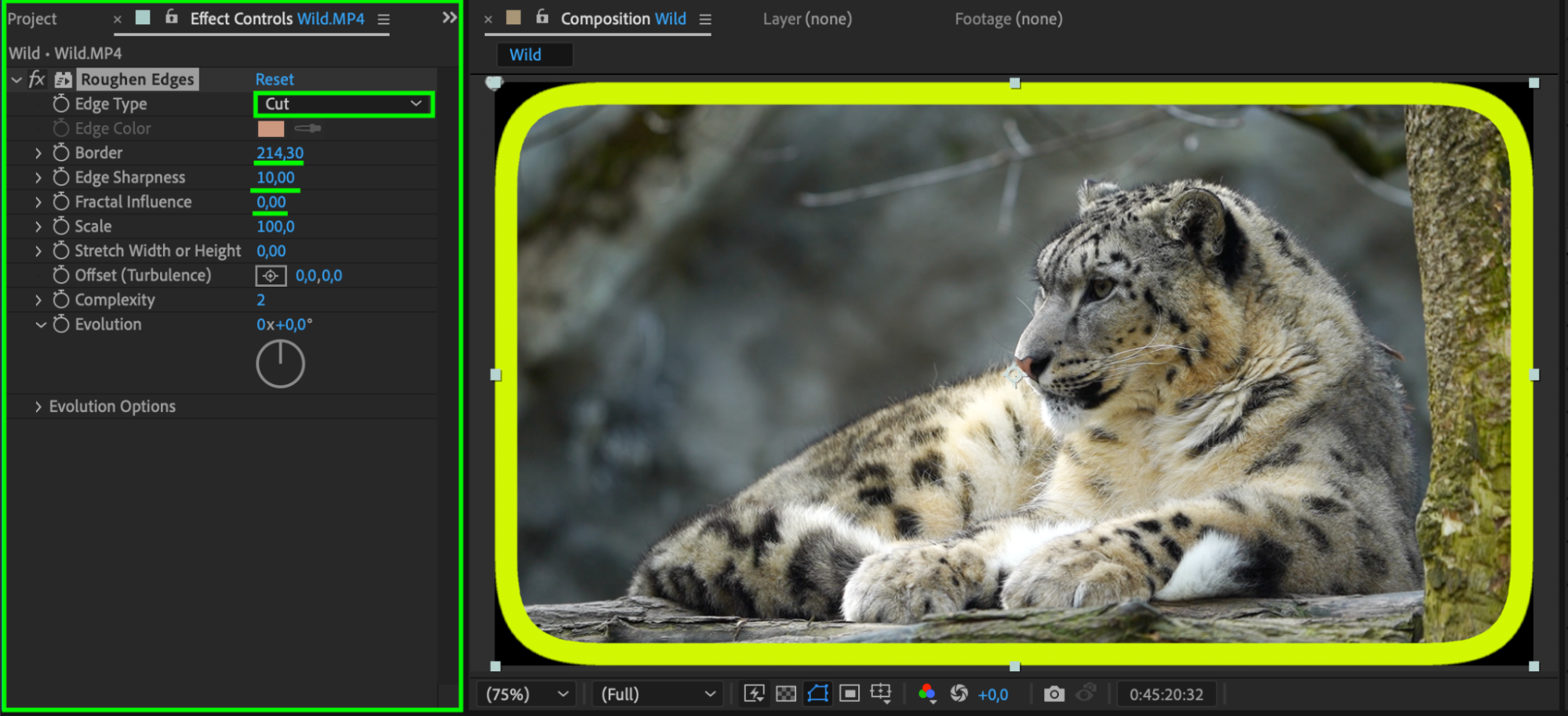 For a textured, rough border, search for the Roughen Edges effect in the Effects & Presets panel. Drag it onto your video layer and adjust the settings in the Effect Controls:
