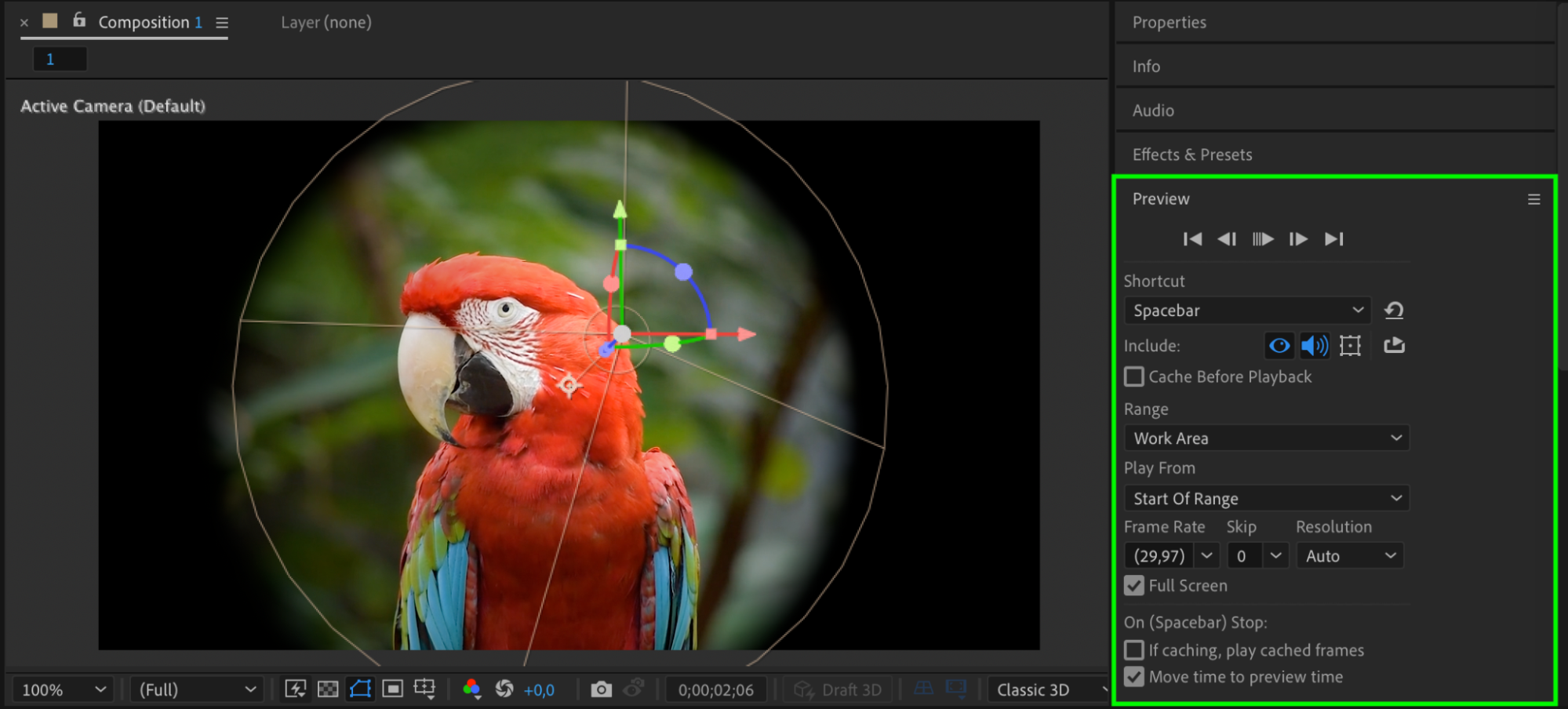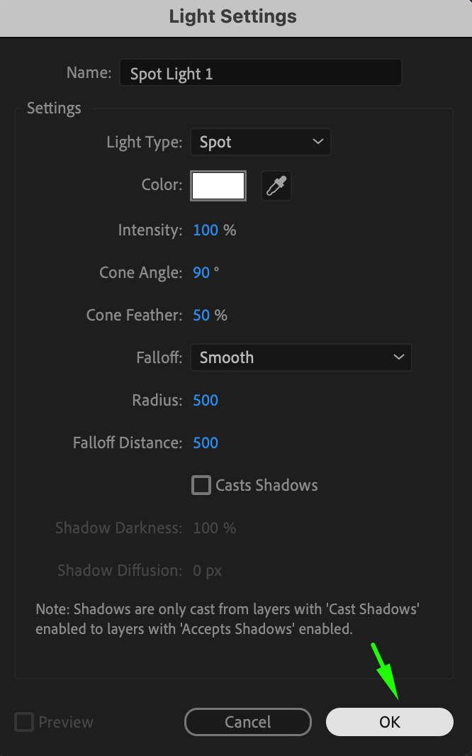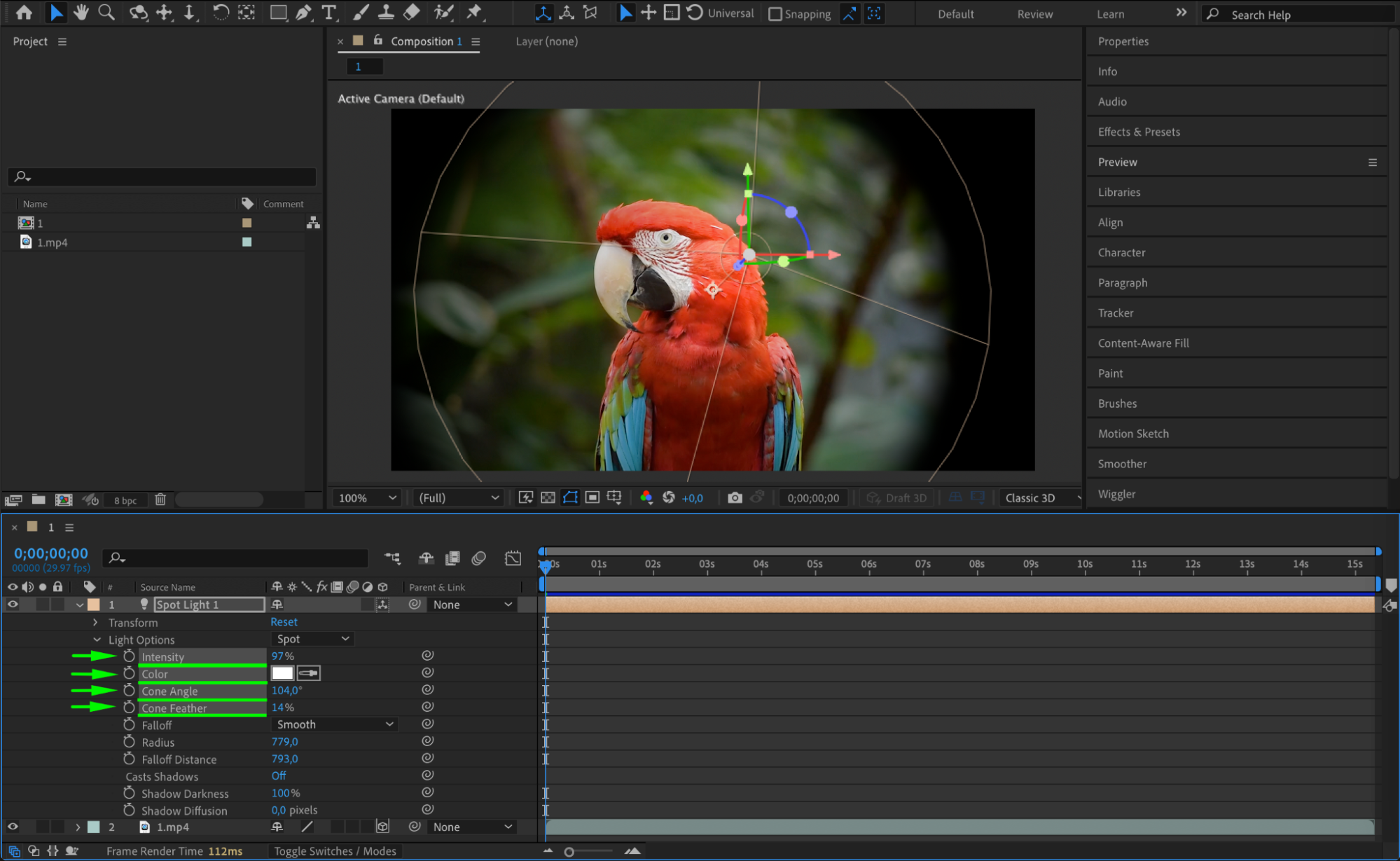 Preview your composition by pressing the Spacebar. This will allow you to see how the light interacts with your scene. Use this step to make fine adjustments to the light’s position, intensity, or animation until you achieve the desired effect.