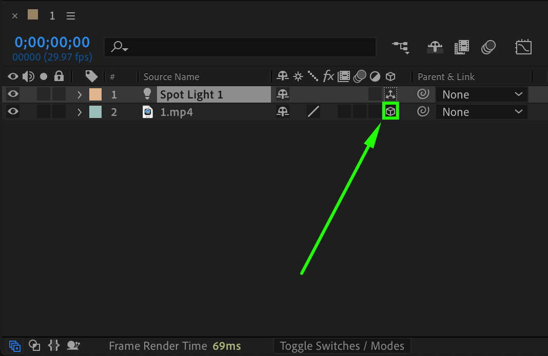 For lights to impact your layers, they must be set to 3D mode. Click the small cube icon in the Switches Panel next to each layer you want illuminated. If you can’t see the cube icon, toggle between Switches and Modes at the bottom of the timeline. This step ensures that the light interacts properly with your composition.