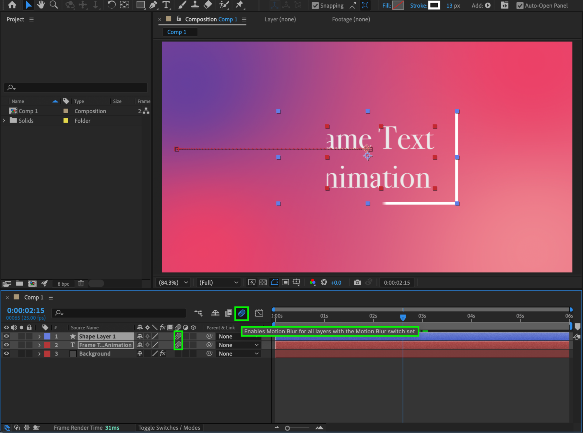 Enable Motion Blur for the text and shape layers, and turn on Motion Blur for the composition.