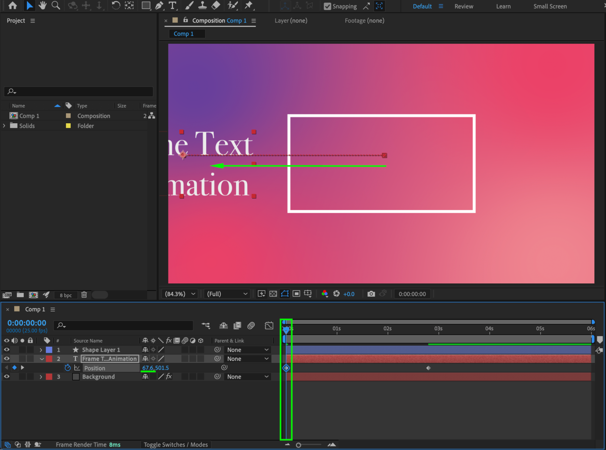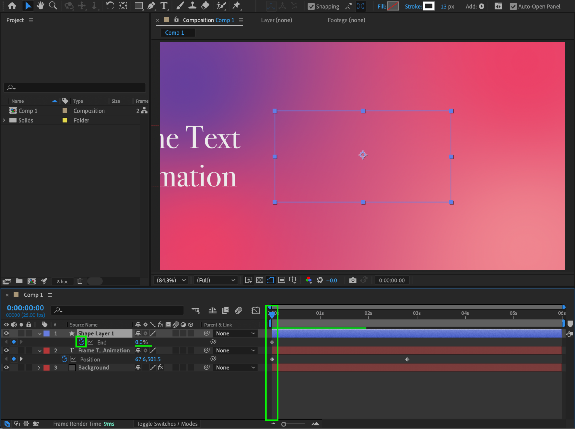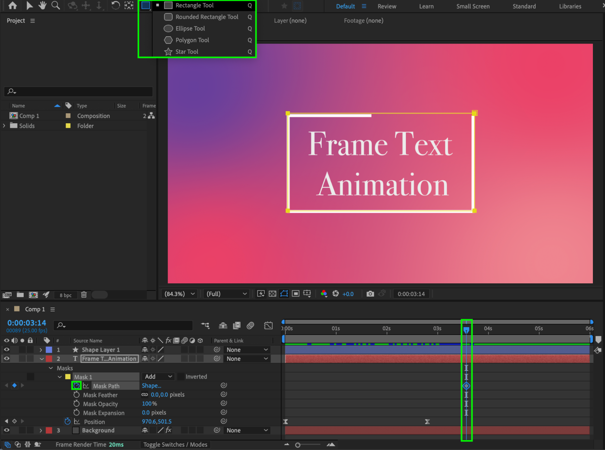 This tutorial explains how to create an animated text effect where text slides into a frame that is drawn on screen. You’ll use text layers, shape layers, Trim Paths animation, masking, and easing to achieve a clean and professional result.