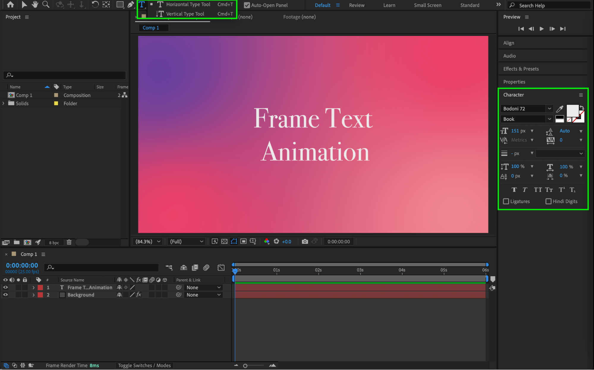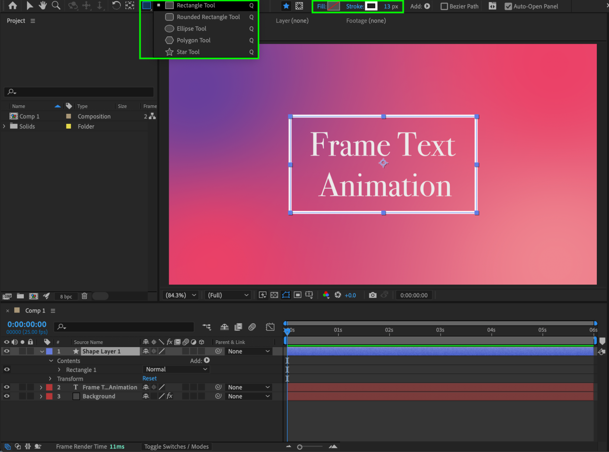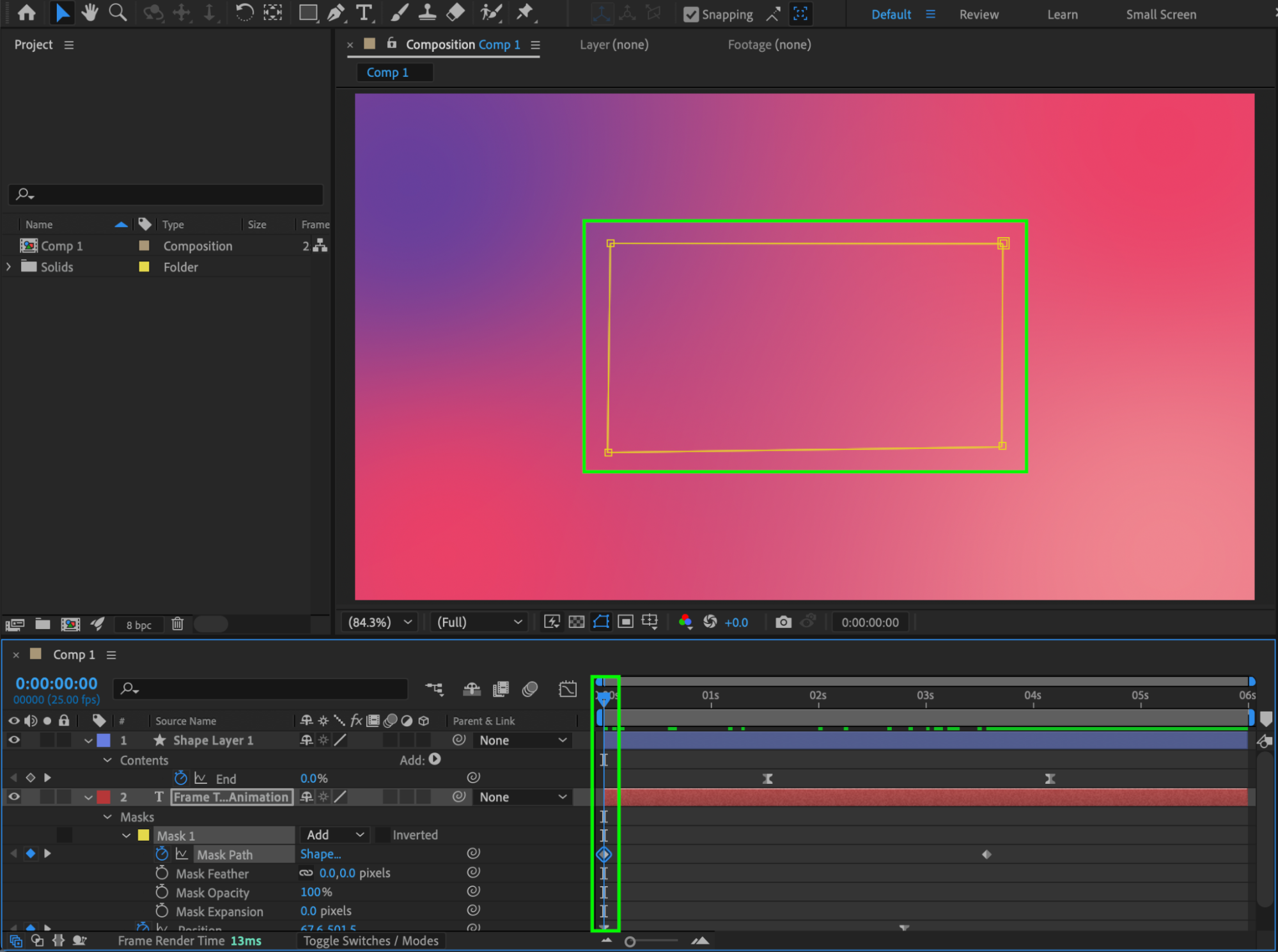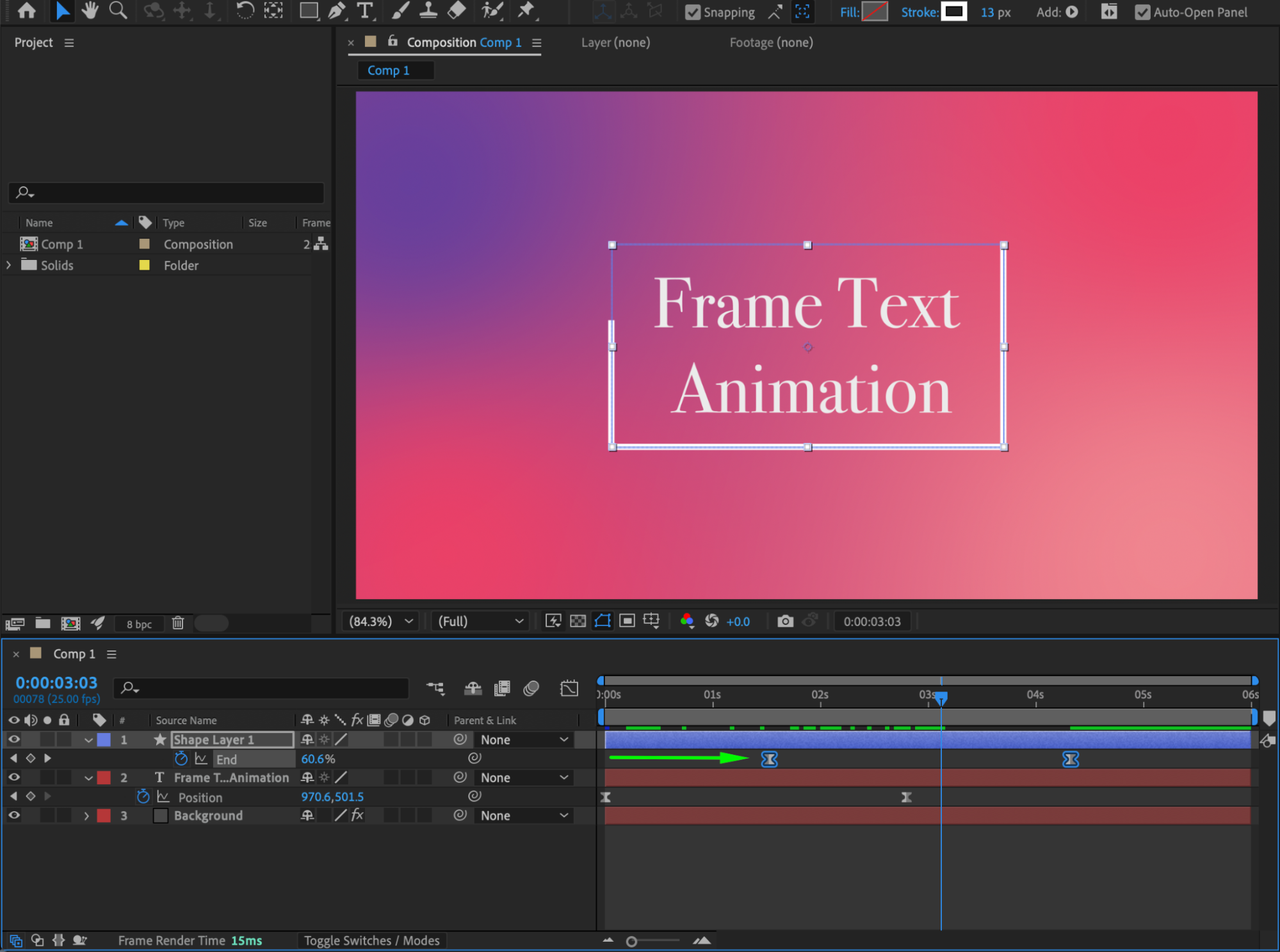 This tutorial explains how to create an animated text effect where text slides into a frame that is drawn on screen. You’ll use text layers, shape layers, Trim Paths animation, masking, and easing to achieve a clean and professional result.