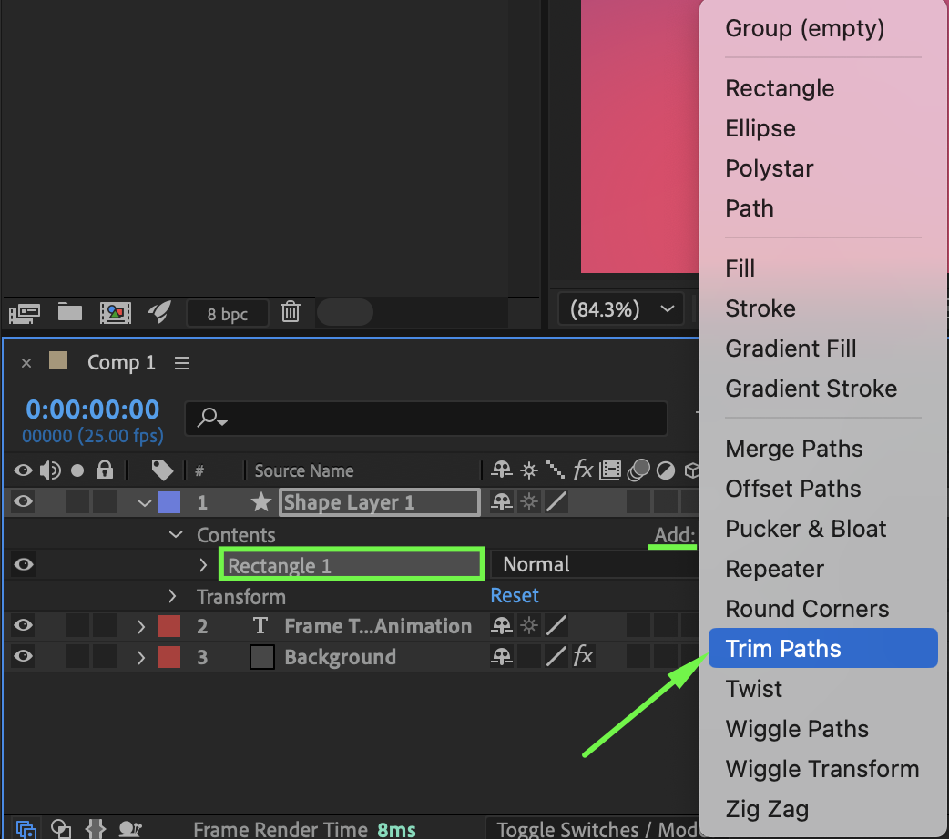 Expand the Rectangle shape properties. Select Rectangle 1, then choose Add > Trim Paths.