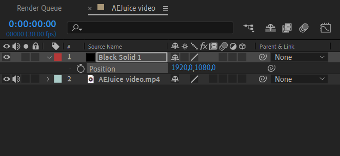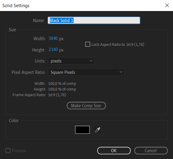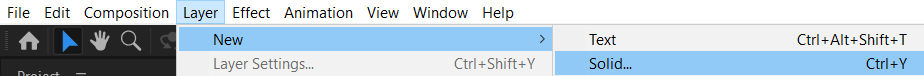 To create the black bars, we will first need to add a solid layer to our composition. You can do this by going to Layer > New > Solid or by using the shortcut “Ctrl/Cmd + Y”. Choose black as the color for the solid layer.