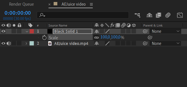 To make the black bars appear at the top and bottom of your video, you need to resize the solid layer. You can do this by clicking on the solid layer in the composition panel and then using the hotkey S to bring up the Scale property.