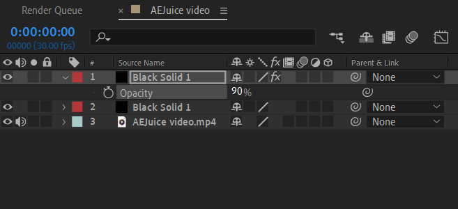 In some cases, you may want to reduce the opacity of the black bars for a more subtle look. Select the solid layer and use the hotkey T to bring up the opacity property. Decrease the opacity to your preferred level.