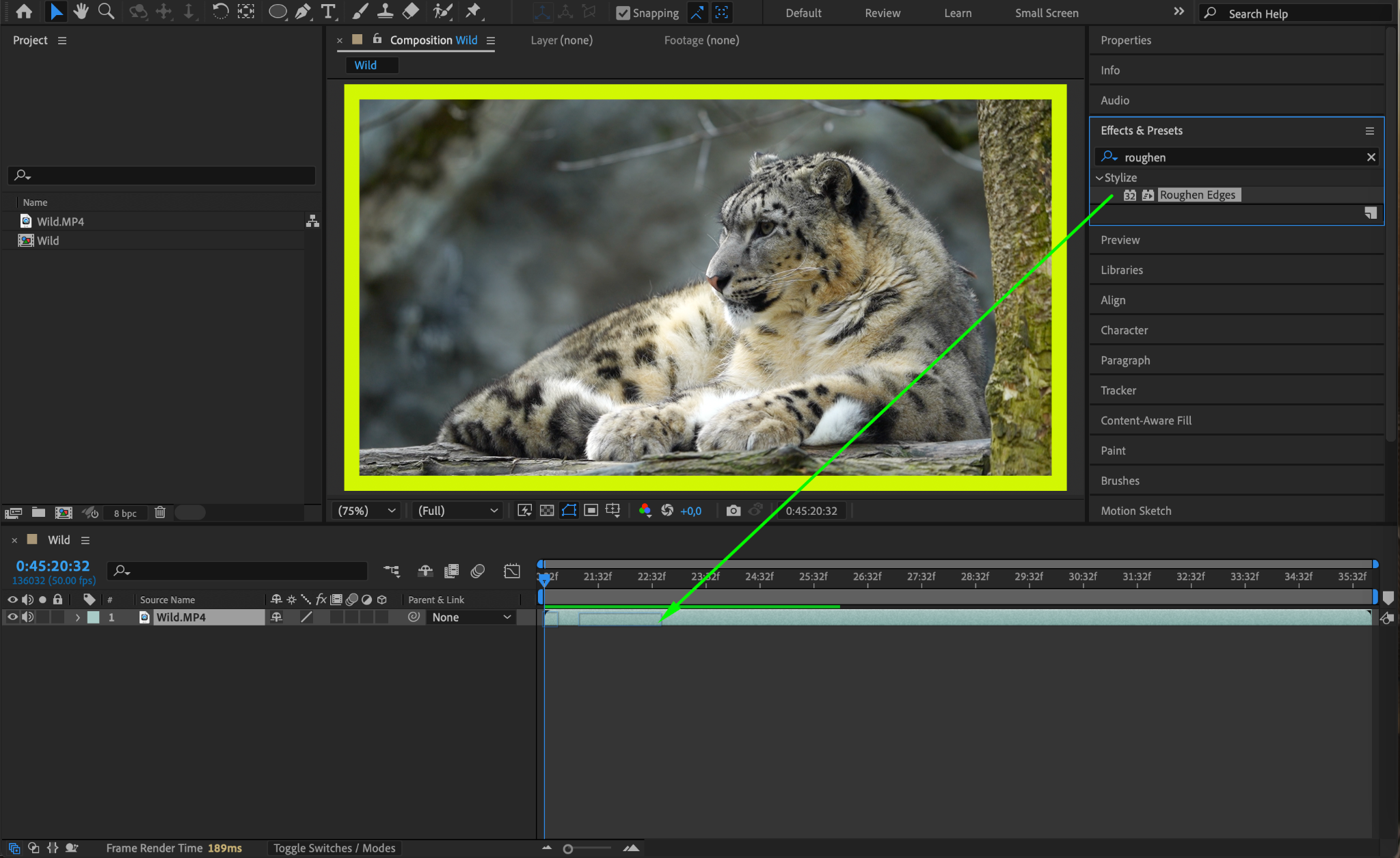 For a textured, rough border, search for the Roughen Edges effect in the Effects & Presets panel. Drag it onto your video layer and adjust the settings in the Effect Controls: