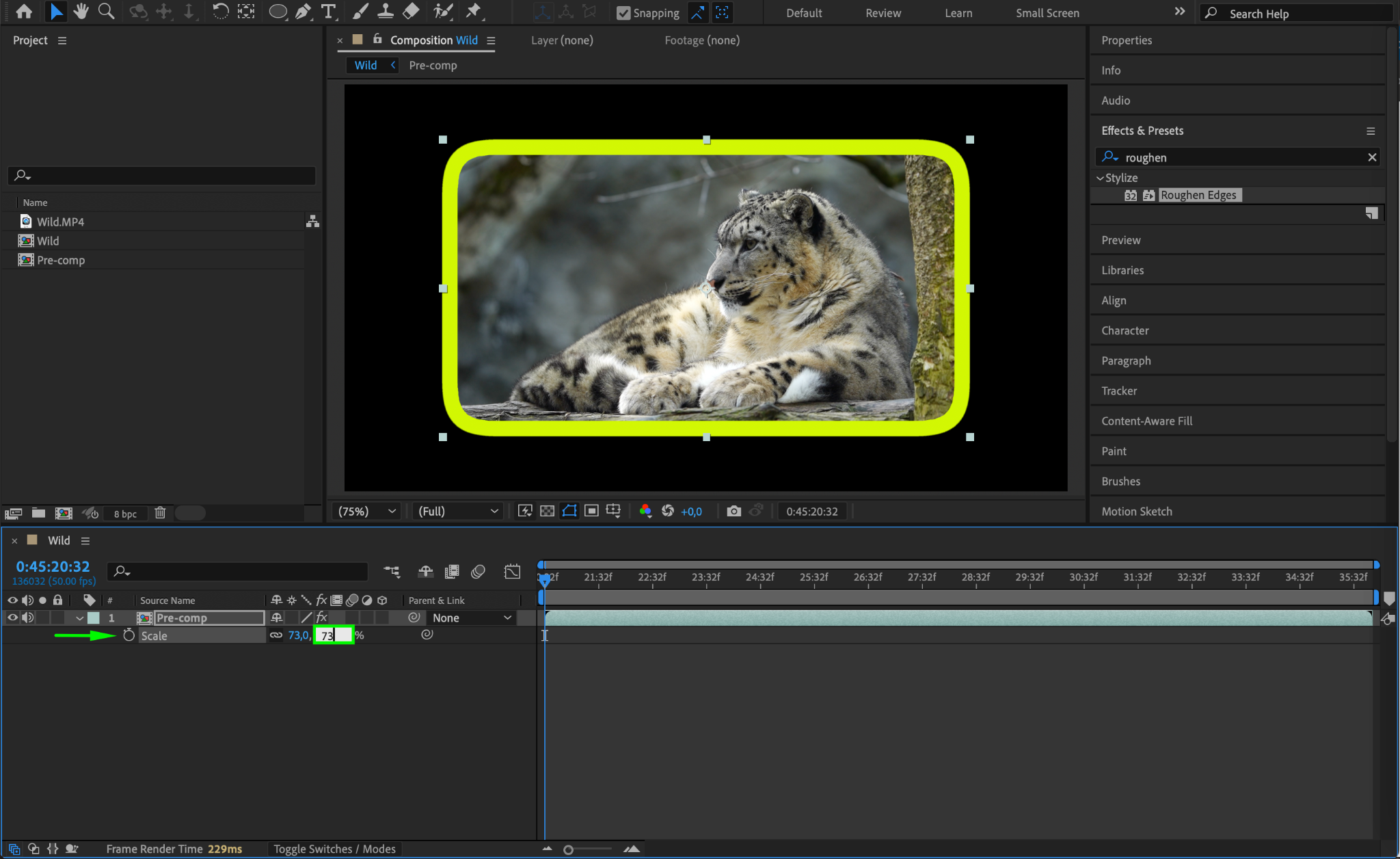 If you need to adjust the video’s size while keeping the border intact, right-click the layer and select Pre-compose. Once pre-composed, adjust the scale of the video within the composition to refine the overall framing.