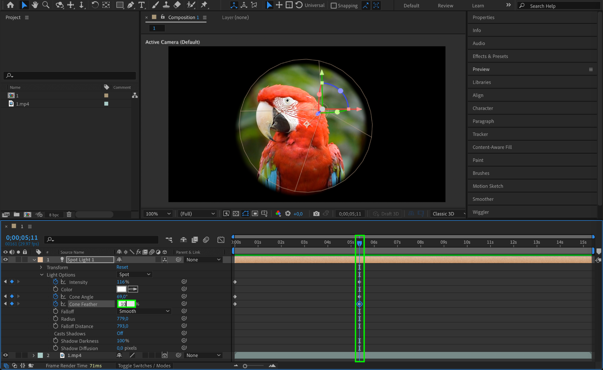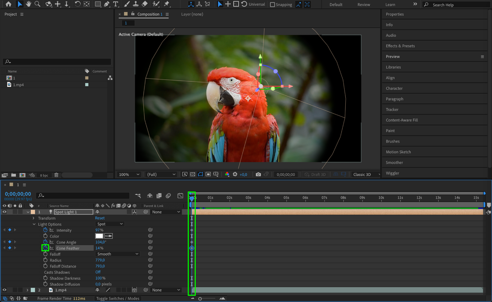 Preview your composition by pressing the Spacebar. This will allow you to see how the light interacts with your scene. Use this step to make fine adjustments to the light’s position, intensity, or animation until you achieve the desired effect.