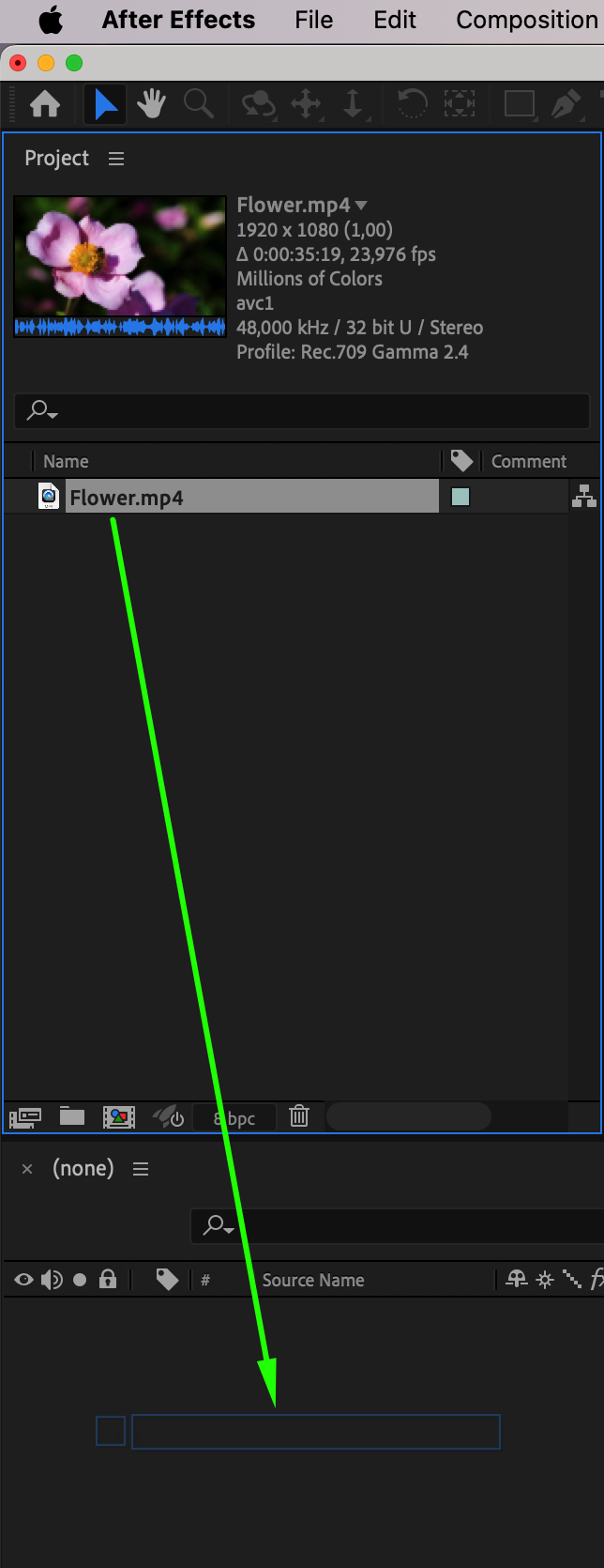 To begin, start by importing your video footage into After Effects. You can do this by going to File, selecting Import, and then choosing the file you want to work with. Drag your file into the timeline panel.