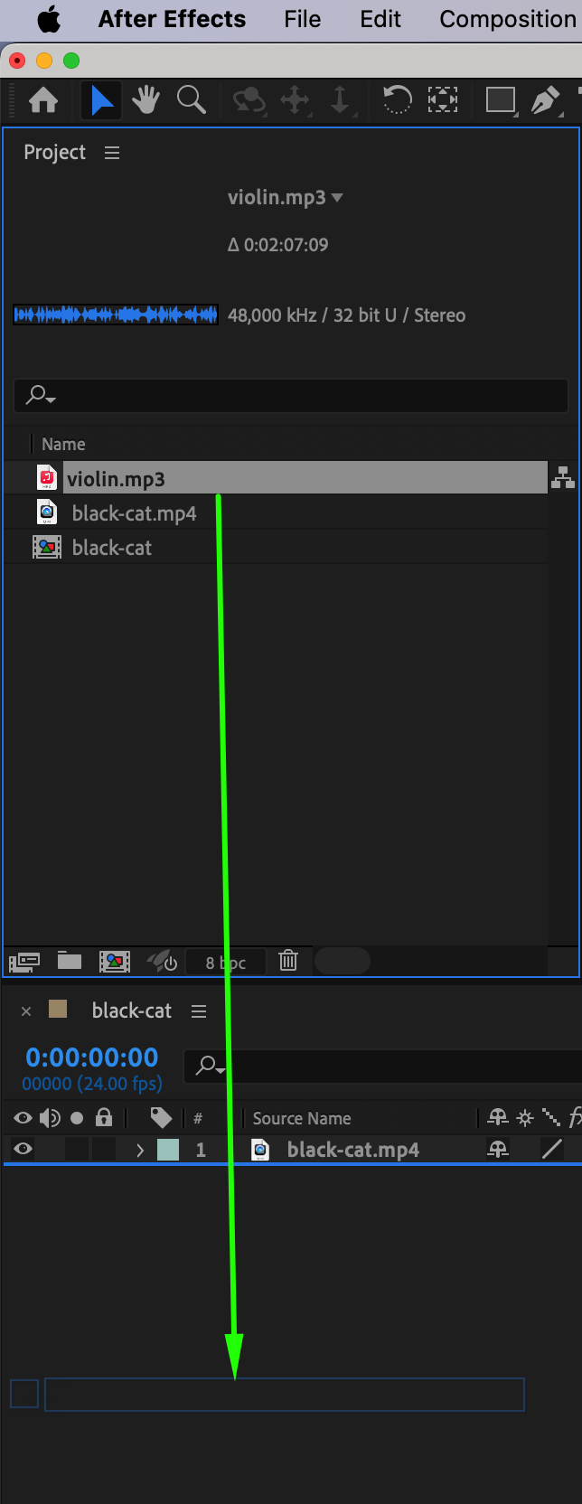 Click and drag the imported MP3 from the Project panel onto your composition’s timeline. Position the audio layer below your video or animation layers. The MP3 will now be part of your composition.