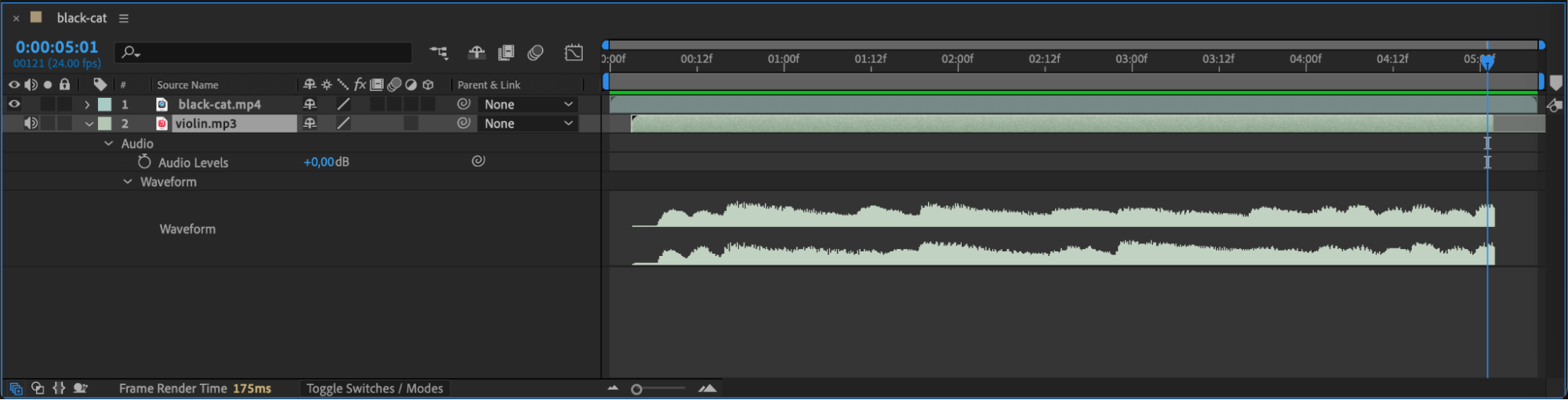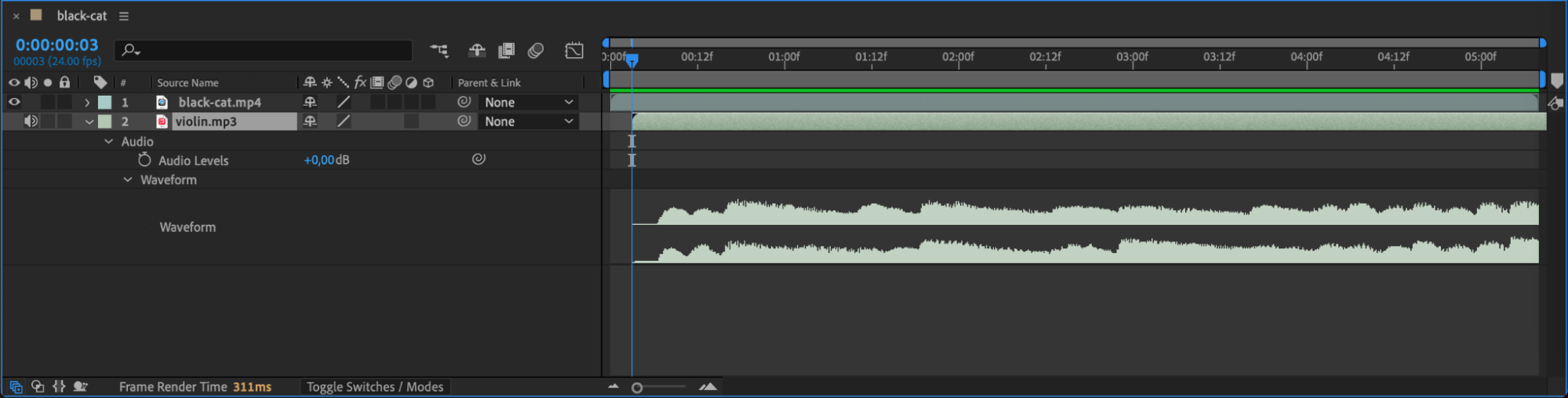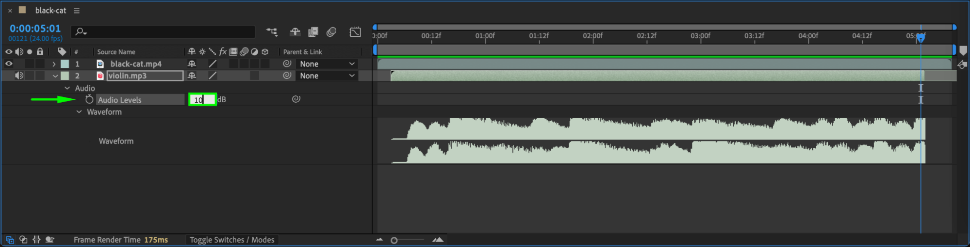 If the MP3 volume is too loud or soft, you can adjust it. Expand the audio layer by clicking the arrow next to it, then adjust the Audio Levels slider. Keyframe this property if you want to fade in or out during specific moments.