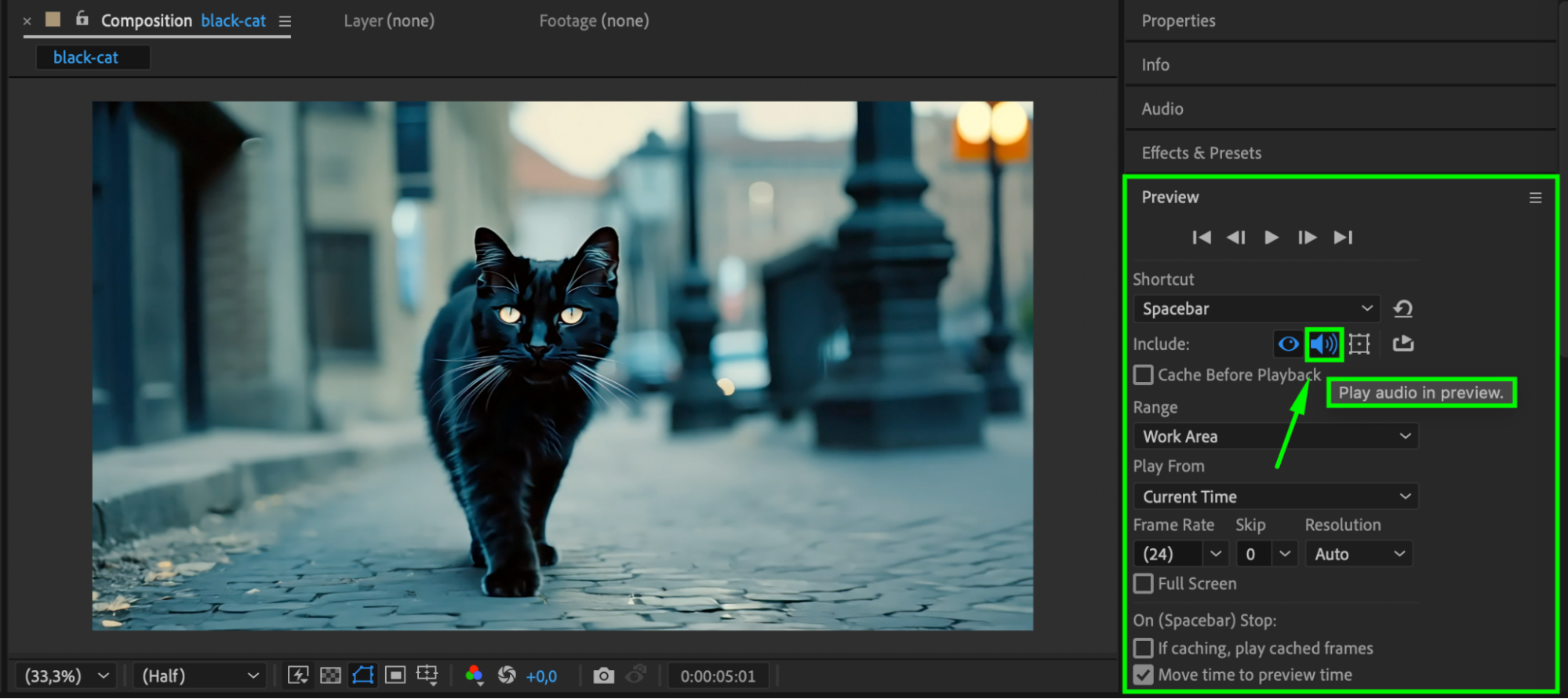 By default, After Effects doesn’t play audio during real-time previews. To hear your MP3 file, enable the audio by clicking the speaker icon next to the audio layer in the timeline. This will allow you to preview the audio alongside your animation.